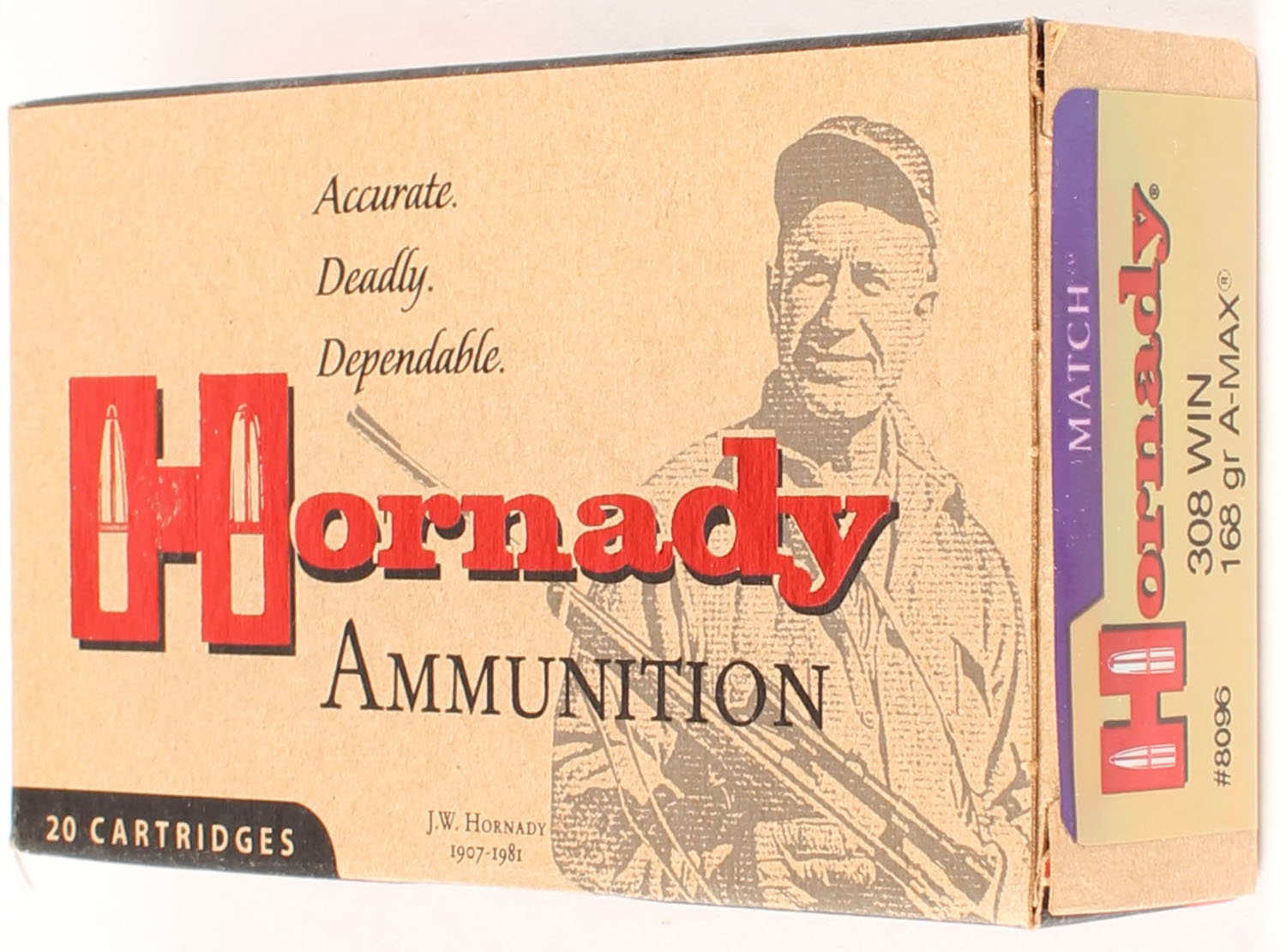 Hornady, Match, .308 Win., 168 Grain A-MAX, Full, 1pc., multi-colored box, box is very solid with excellent color, ammo is minty. Grade: Excellent ++ - Value: 30 to 45