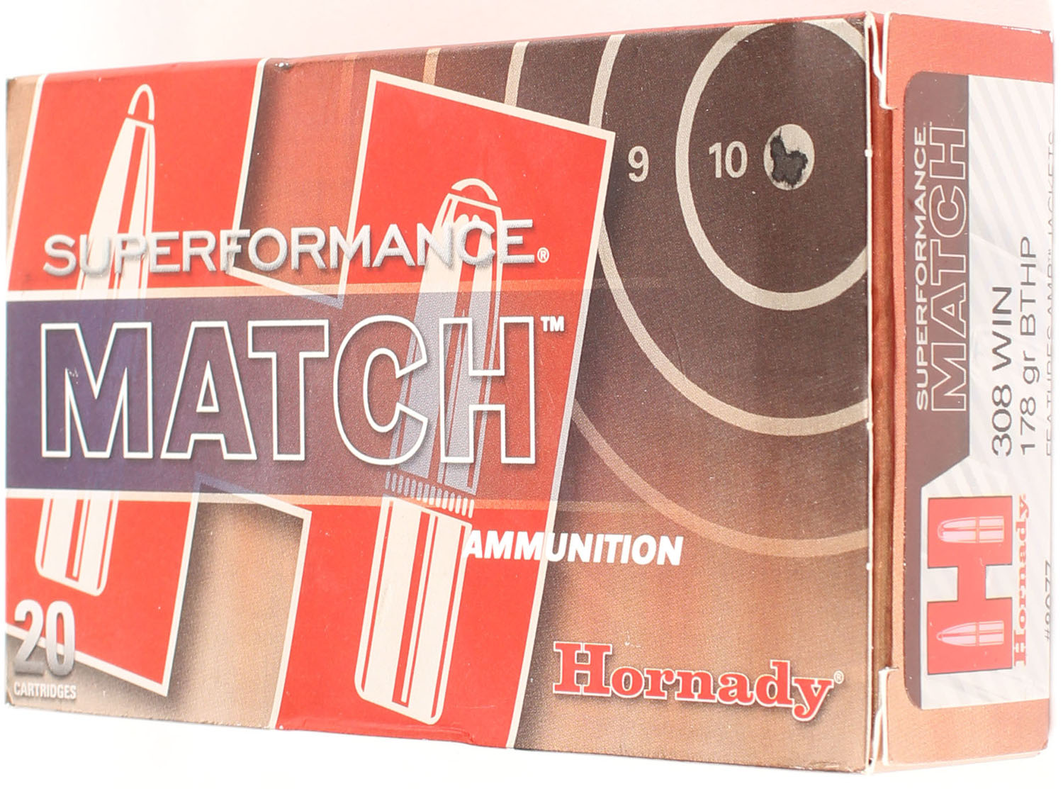 Hornady, Superformance Match, .308 Winchester, 178 Grain Boat Tail Hollow Point, Full, 1pc., multi-colored box, box is very solid, with excellent color, Ammo is minty. Grade: Excellent ++ - Value: 30 to 45