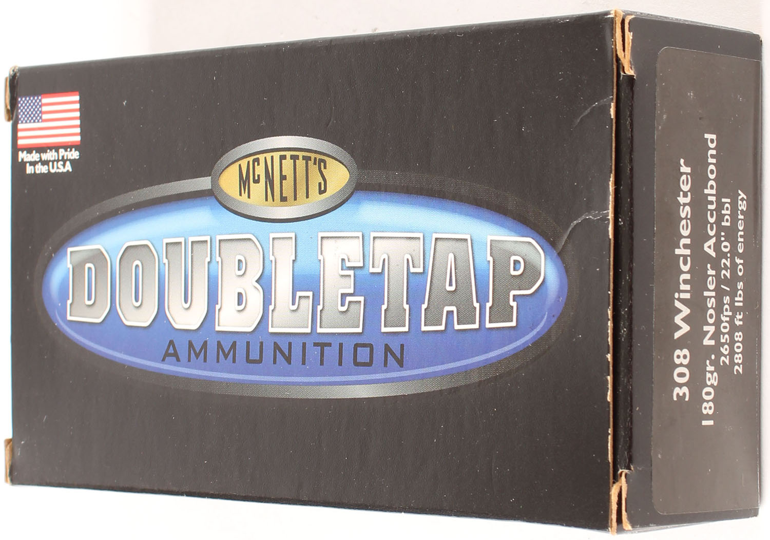 McNett's, Double Tap Ammunition, .308 Winchester, 180 Grain Nosler Accubond, Full, 1pc. Multi-colored box, box is very solid, end flaps are solid, edges are crisp, ammo is very good. Grade: Excellent - Value: 16 to 24