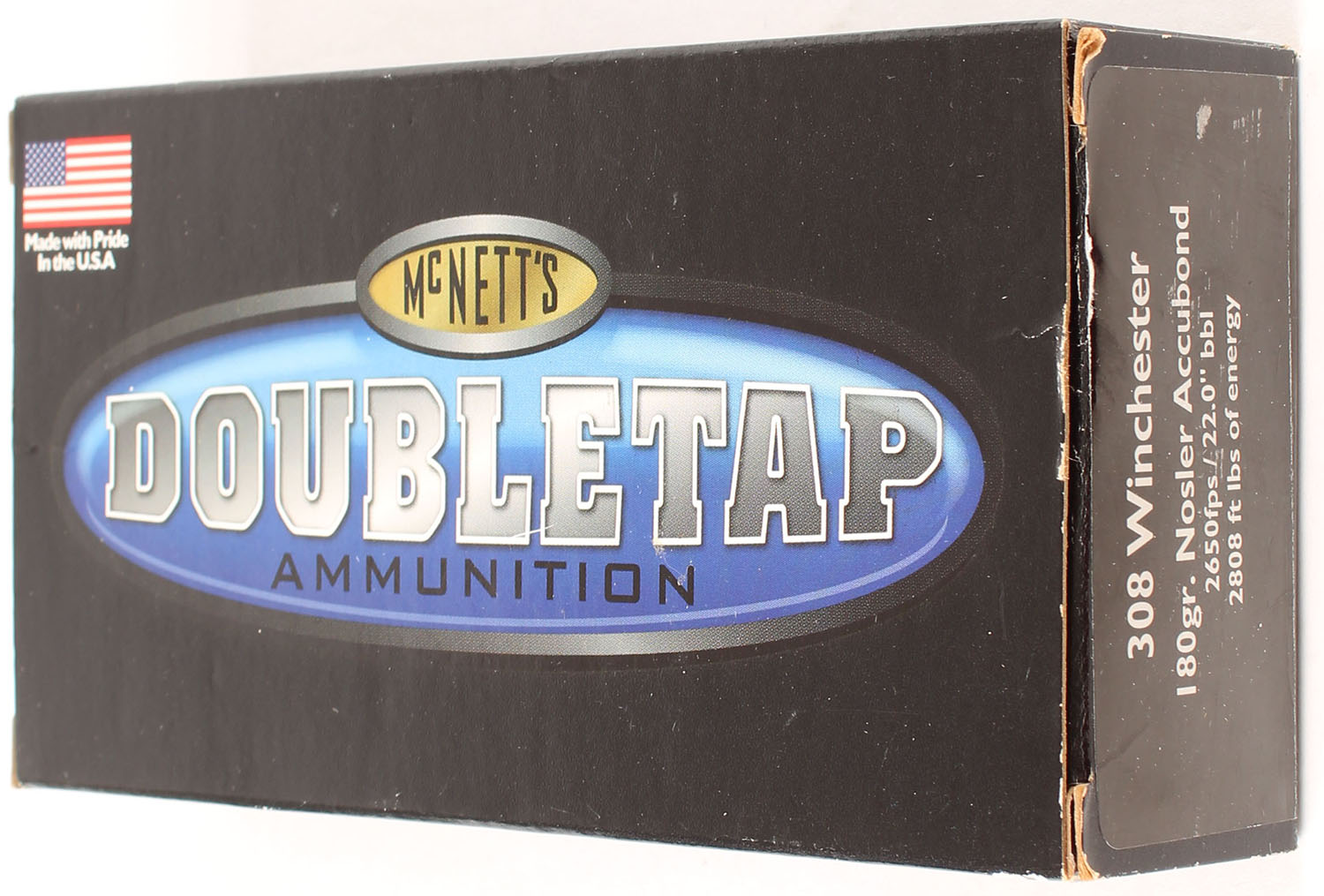 McNett's, Double Tap Ammunition, .308 Winchester, 180 Grain Nosler Accubond, Full, 1pc. Multi-colored box, box is very solid, end flaps are solid, edges are crisp, ammo is excellent. Grade: Excellent - Value: 16 to 24