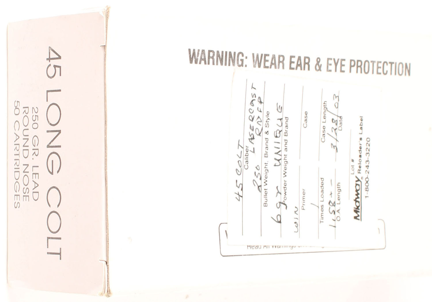 Midway reloaded ammunition .45 Long Colt, 250 Gr. RN, Full, 1pc, White box with black print, Reloaded by Midway, box is solid, ammo is very good. Grade: Very Good - Value: 12 to 18