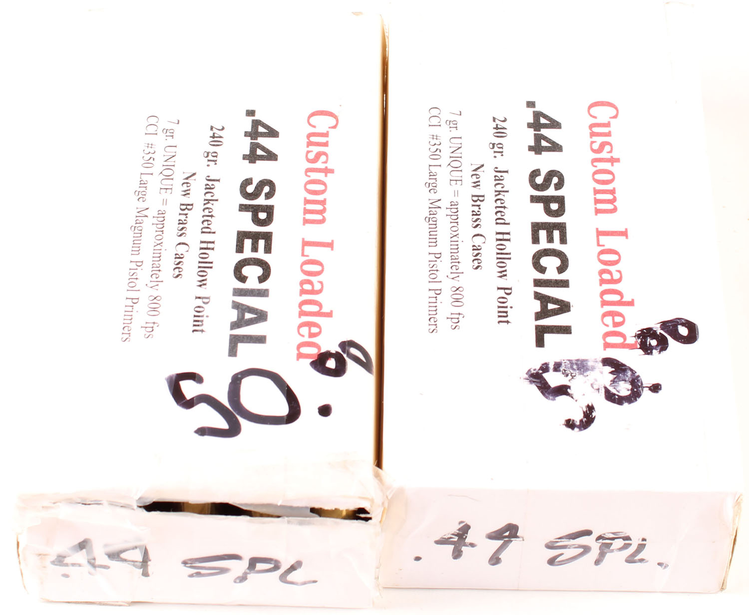 Custom Loaded, Lot of (2), .44 Special, 240 Grain JHP, Full, 1pc. White box with black print, box has tape wrapped around, ammo is excellent. Grade: Very Good - Value: 30 to 45