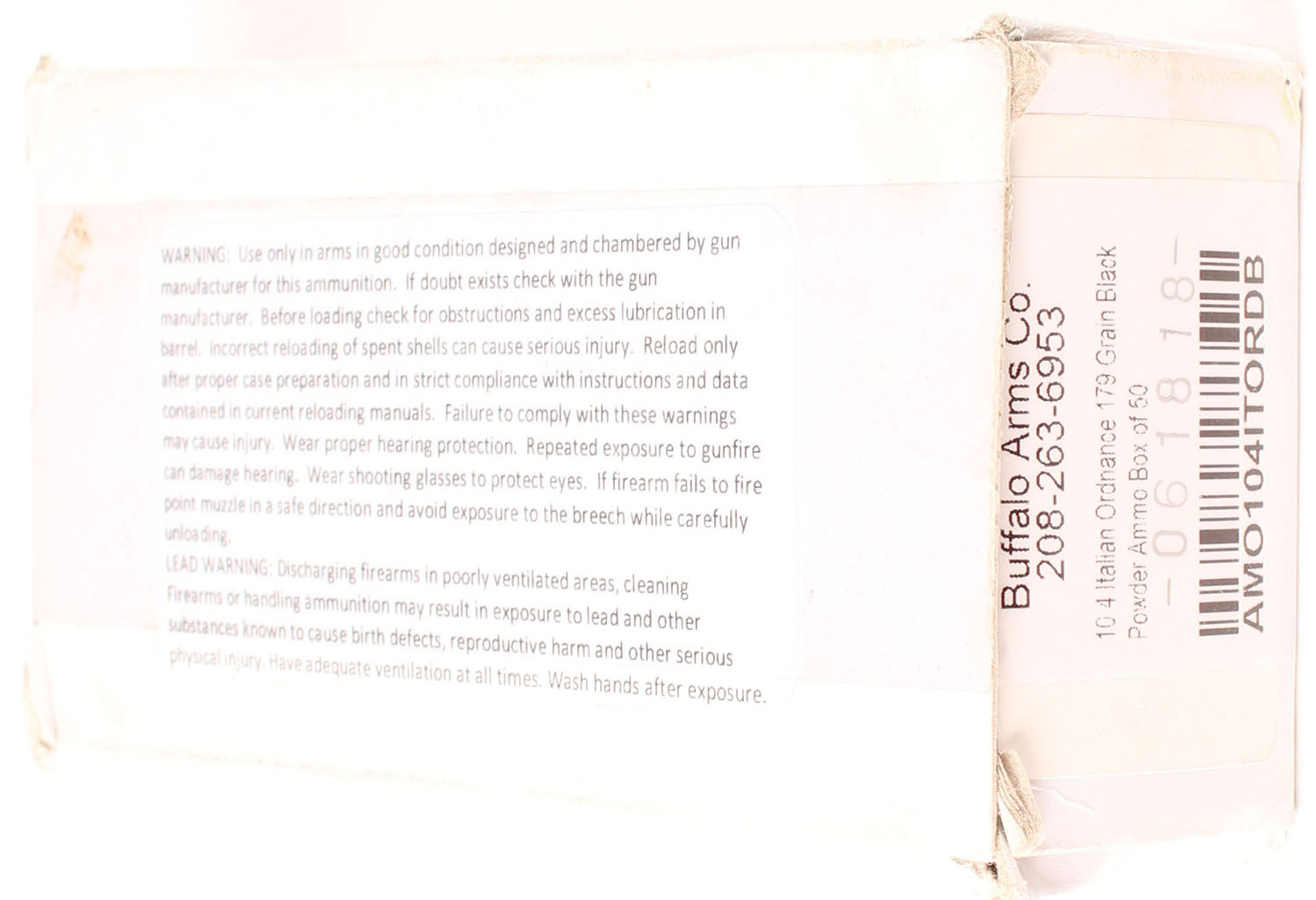 Buffalo Arms Co., .44 Smith & Wesson Special, 179 Grain Black Powder, Full, 1pc., white box with black print, ammo is very good. Grade: Very Good - Value: 20 to 30