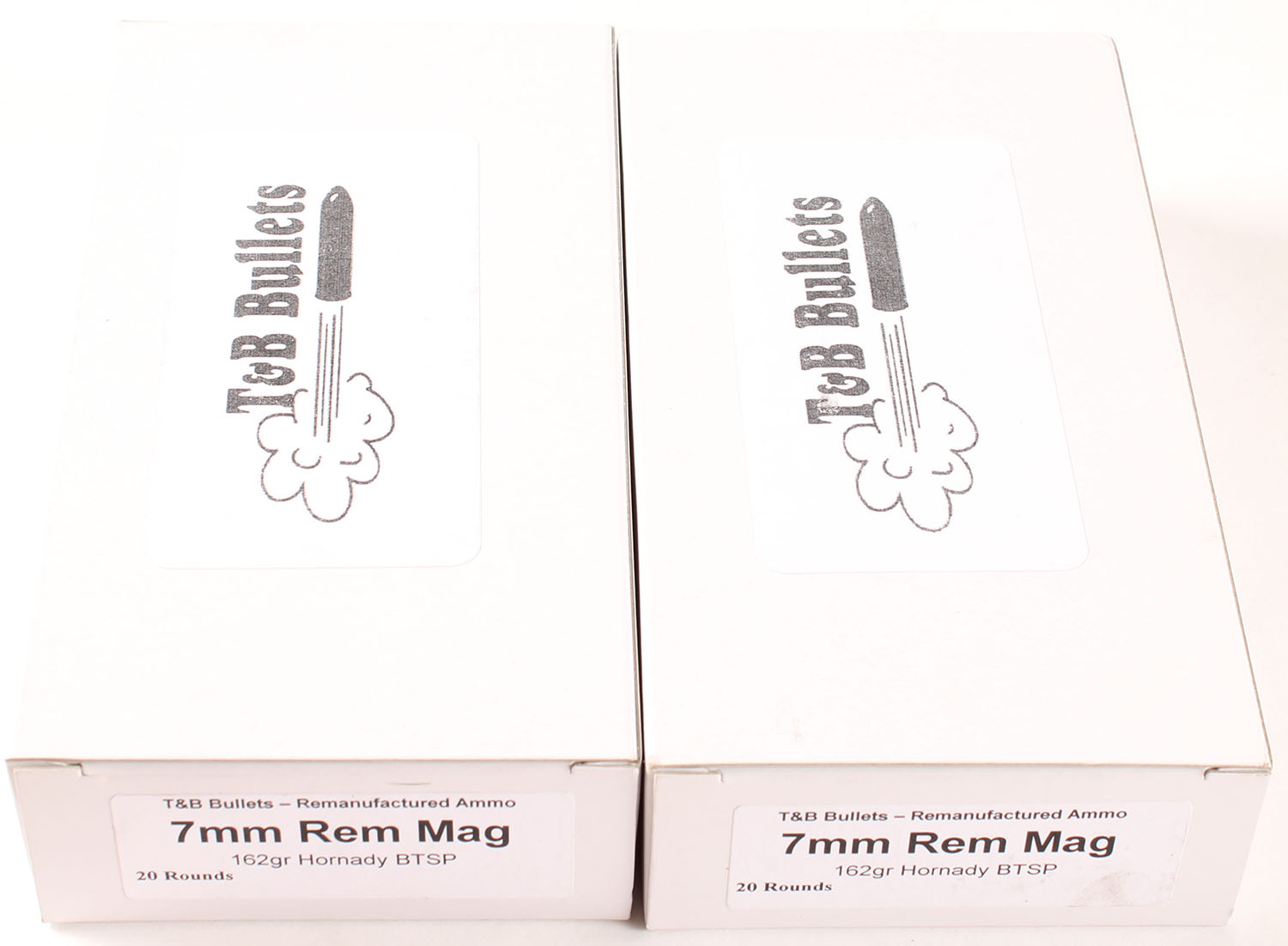 T&B Bullets, Lot of (2), 7mm Rem. Mag, Remanufactured Ammo by a class type 7 Ammo MFG (this is the same class (high quality) as Winchester, Federal and or CCI), 162 Grain Hornady BTSP bullet, loaded cartridges, Full, 1pc, white boxes are very solid, ammo is minty. Grade: Excellent ++ - Value: 20 to 30