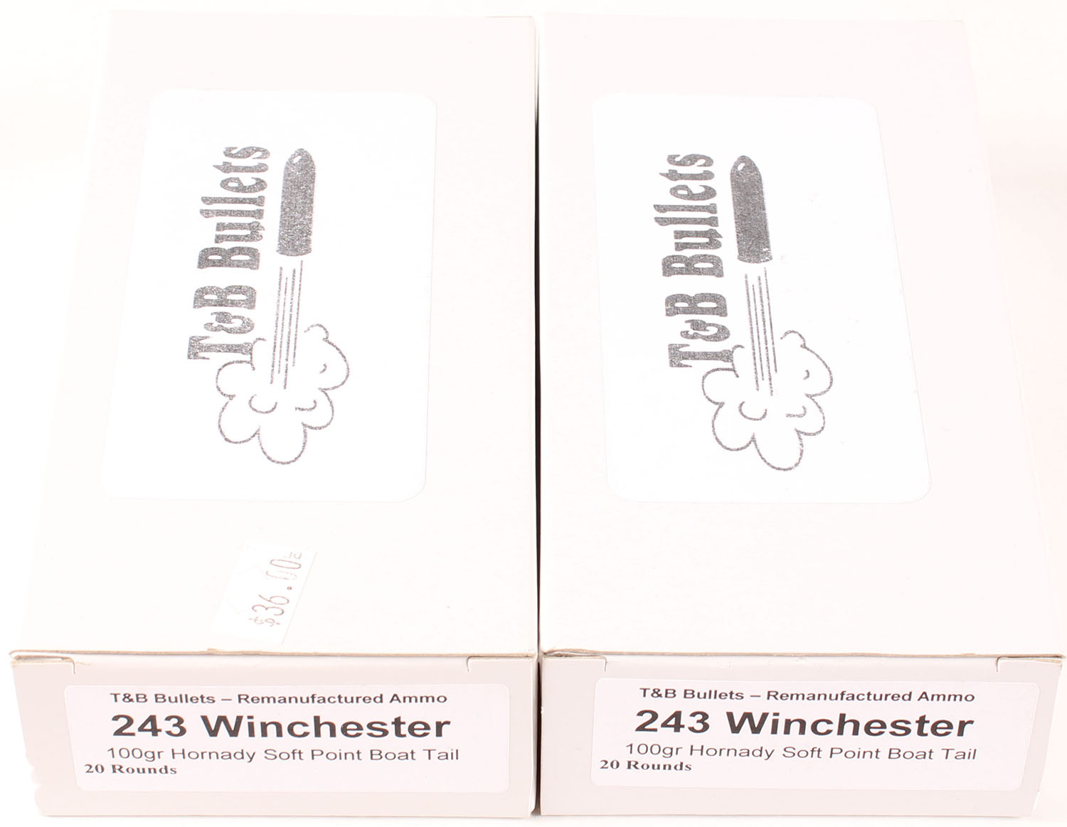 T&B Bullets, Lot of (2), .243 Winchester, Remanufactured Ammo by a class type 7 Ammo MFG (this is the same class (high quality) as Winchester, Federal and or CCI, 100 Grain Hornady BTSP bullet, loaded cartridges, Full, 1pc, white boxes are very solid, ammo is minty. Grade: Excellent ++ - Value: 20 to 30