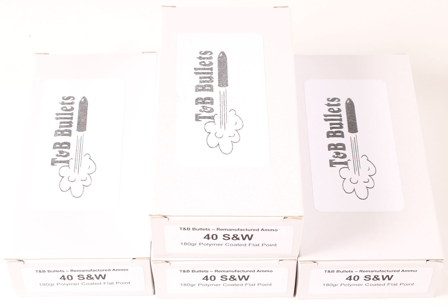 T&B Bullets, Lot of (4), .40 Smith & Wesson, Remanufactured Ammo by a class type 7 Ammo MFG (this is the same class (high quality) as Winchester, Federal and or CCI), 180 Grain Polymer Coated Flat Point bullet, loaded cartridges, 1pc, Full 50 count boxes, white boxes are very solid, ammo is minty. Grade: Excellent ++ - Value: 30 to 45