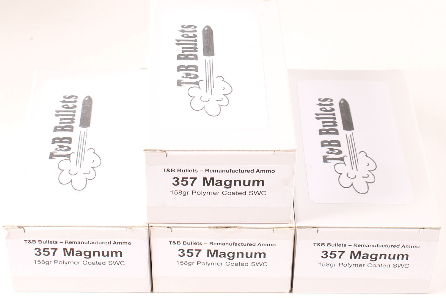 T&B Bullets, Lot of (4), .357 Magnum, Remanufactured Ammo by a class type 7 Ammo MFG (this is the same class (high quality) as Winchester, Federal and or CCI), 158 Grain Polymer Coated SWC bullet, loaded cartridges, 1pc, Full 50 count boxes, white boxes are very solid, ammo is minty. Grade: Excellent ++ - Value: 30 to 45