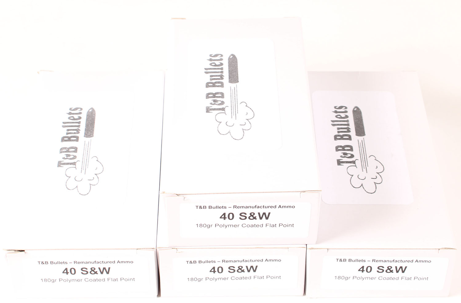 T&B Bullets, Lot of (4), .40 Smith & Wesson, Remanufactured Ammo by a class type 7 Ammo MFG (this is the same class (high quality) as Winchester, Federal and or CCI), 180 Grain Polymer Coated Flat Point bullet, loaded cartridges, 1pc, Full 50 count boxes, white boxes are very solid, ammo is minty. Grade: Excellent ++ - Value: 30 to 45