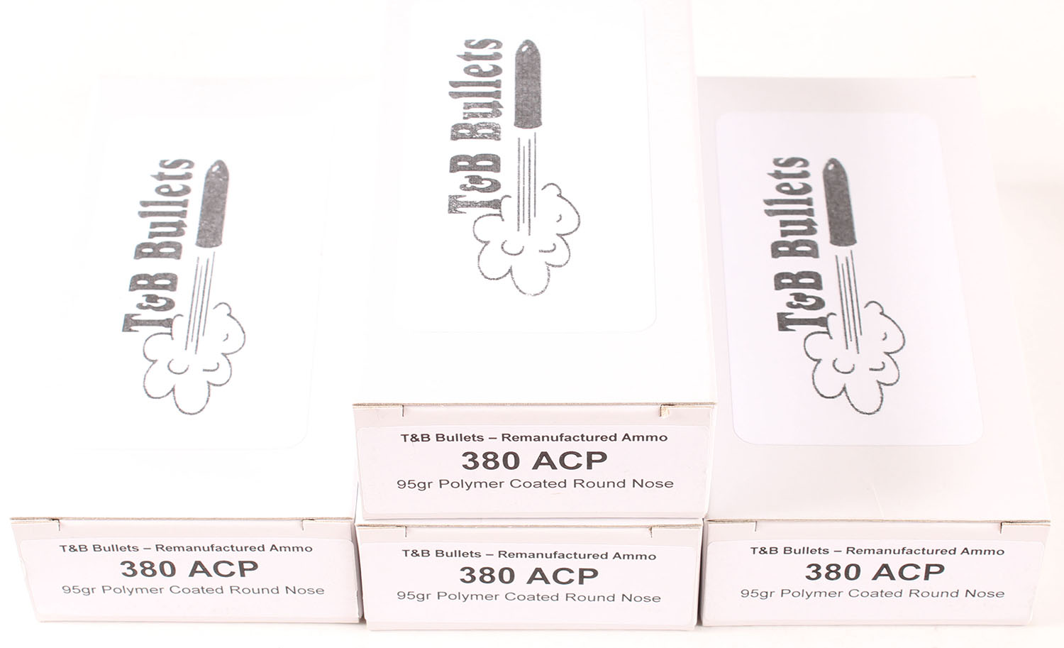 T&B Bullets, Lot of (4), .380 ACP, Remanufactured Ammo by a class type 7 Ammo MFG (this is the same class (high quality) as Winchester, Federal and or CCI), 95 Grain Polymer Coated Round Nose bullet, loaded cartridges, 1pc, Full 50 count boxes, white boxes are very solid, ammo is minty. Grade: Excellent ++ - Value: 30 to 45