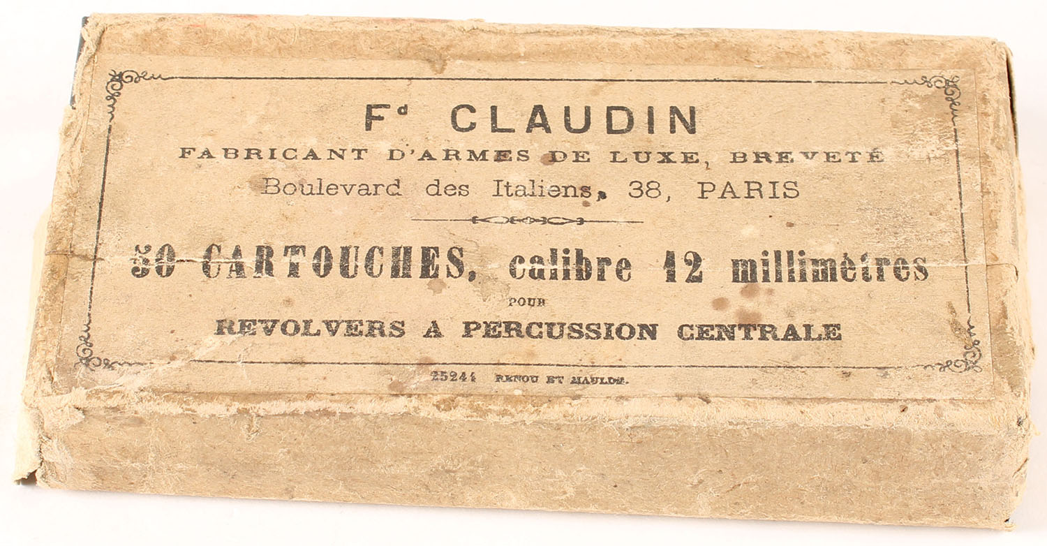 F. Claudin, 12mm Central Percussion Revolvers, 2pc, Empty, Tin box with buff & black label, box and label have age soiling & scuffing. Grade: Good + - Value: 10 to 15