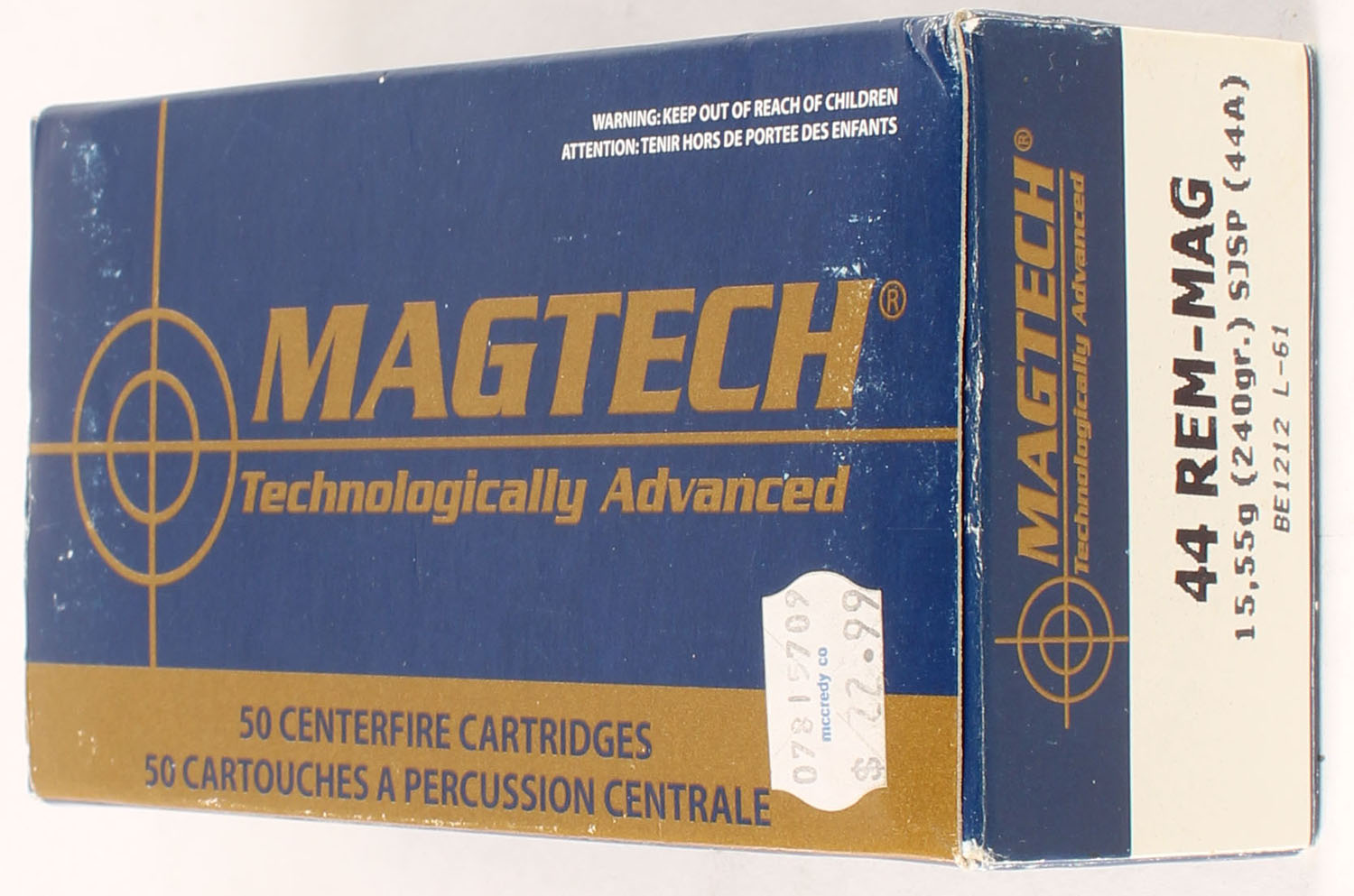 Magtech, .44 Rem-Mag, 240 Grain, SJSP, Full, 1pc, Blue & gold box, box is very solid, ammo is excellent. Grade: Excellent ++ - Value: 30 to 45