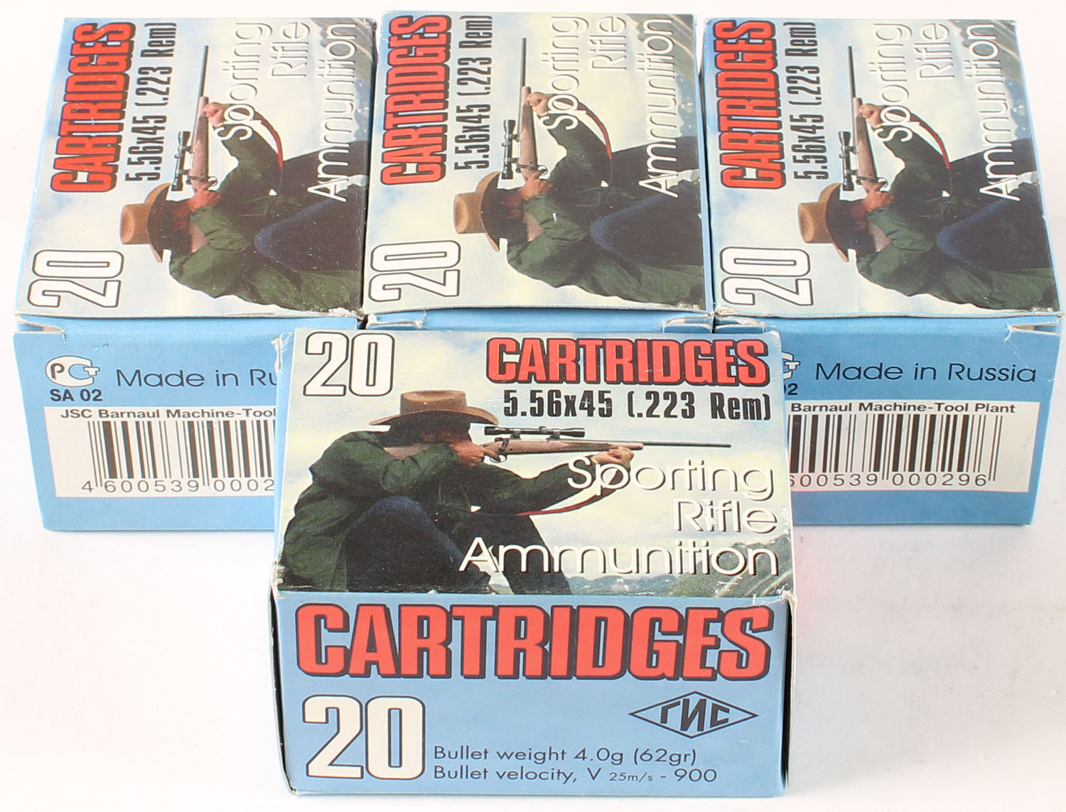 Barnaul Ammunition, Lot of (4), .223 Rem., 62 Grain FMJ BT., Full, 1pc, Multi-colored boxes, boxes are very solid, ammo is sealed in paper. Grade: Excellent ++ - Value: 40 to 60