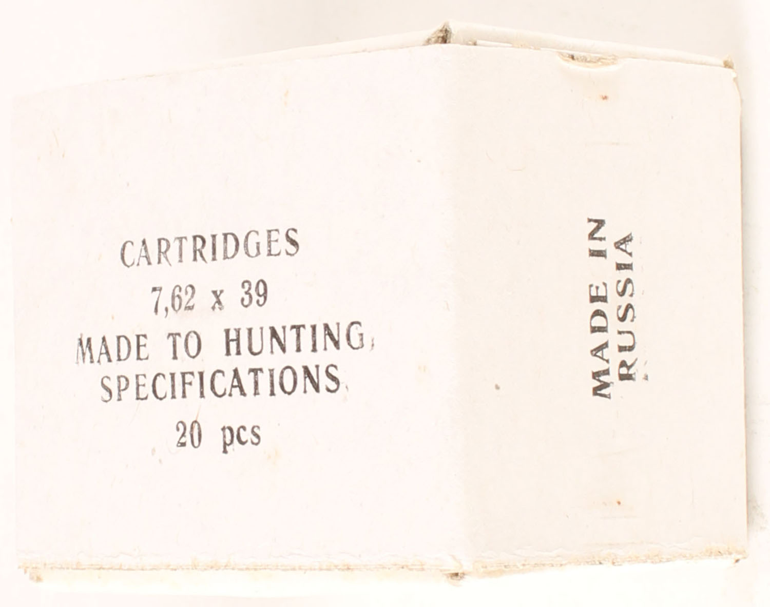 Unknown Russian Mfg., 7,62 x 39, Full, 1pc, white box with black print, box is solid, ammo is excellent. Grade: Excellent - Value: 12 to 18