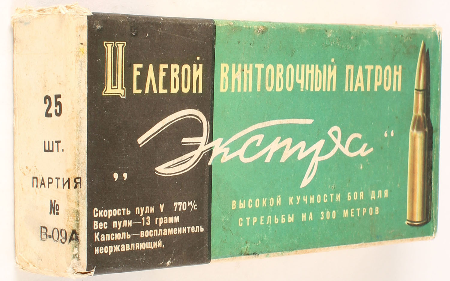 Unknown Russian Mfg., 7,62 x 54 R, Target Rifle Cartridge, FULL & SEALED, 2pc, Multi-colored box, box has edge & corner wear. Grade: Very Good + - Value: 30 to 45