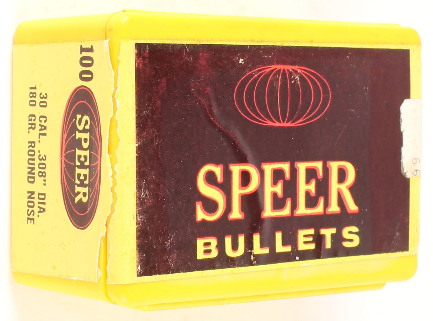 Speer, .30 Cal., 180 Grain RN, .308'' Dia., Appears Full, Yellow & black plastic box, box is solid, bullets are minty. Grade: Excellent - Value: 6 to 12