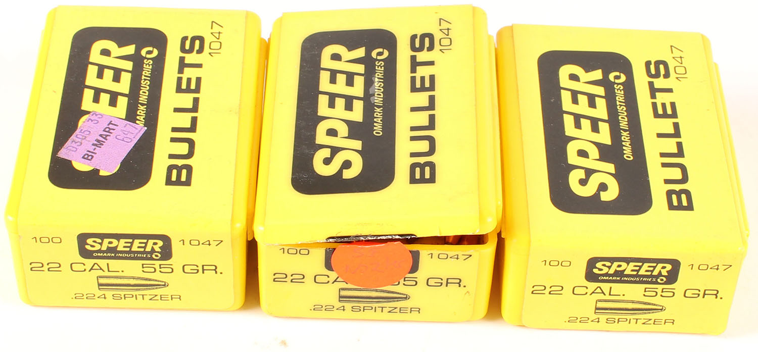 Speer, Lot of (3), .22 Cal., 55 Grain, .224'' Spitzer, (2) FULL & SEALED, (1) Partial, Multi-colored boxes, boxes are very solid. Grade: Excellent + - Value: 30 to 45