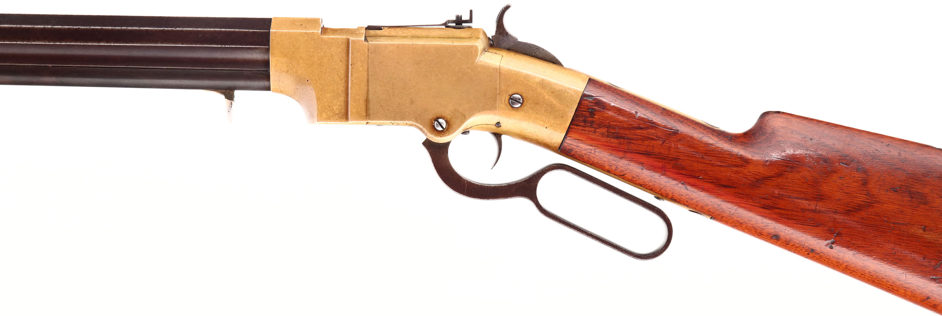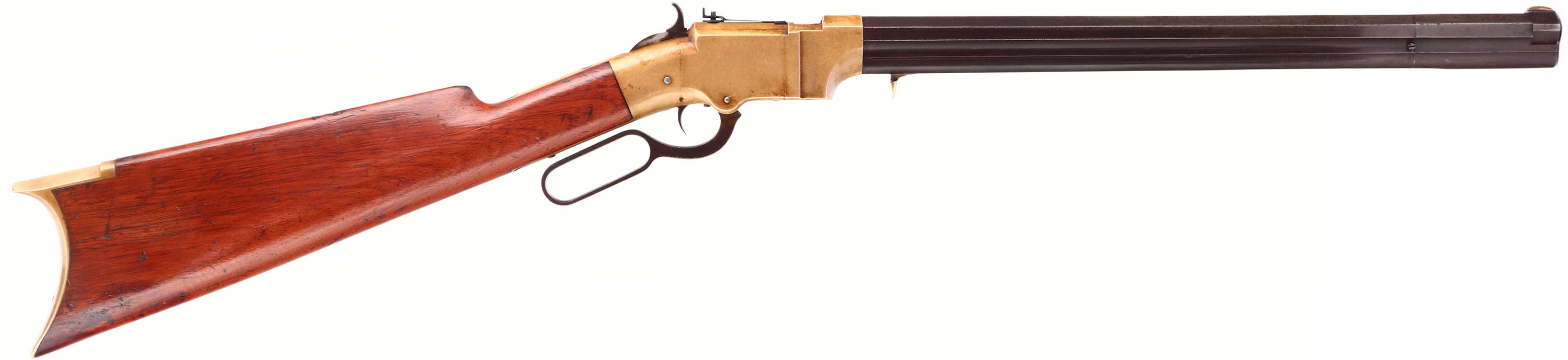 FANTASTIC Volcanic Lever Rifle, .41 Volcanic., MFG. 1857, SN: 154, Lever Action Rifle. This Volcanic Lever Action Carbine was manufactured by the New Haven Arms Company c. 1857. The diminutive carbine has a 16 1/2-inch barrel with integral 20-shot magazine. The barrel has a nickel-silver front sight blade & blue finish, which has toned to a smooth & even plum brown patina. Some light pitting on the barrel. The top flat is stamped: ''NEW HAVEN CONN. PATENT FEB. 14. 1854'' in one line. The rifle has a brass receiver & crescent buttplate. The receiver has a dove-tail mounted rear sight, with thumb-wheel elevator. The rear sight, bolt & top of the cartridge elevator are fire blue. The hammer has deep, borderless, hand-cut knurling on the spur. The hammer, trigger,& lever are color casehardened. The straight grain, American walnut stock has a high polish varnished ''piano'' finish which remains very good, with minor scuffs, scrapes, & contusions. The serial number is stamped: (1) on the lower left side of the receiver tang, (2) the inside of the buttplate, and (3) shanks of the hand fitted buttplate and tang screws . All of the visible SN's match. Bore is good, with areas of pitting amongst strong rifling. The New Haven Arms Company manufactured approximately 1,000 carbines, with 16 1/2, 21 & 25-inch barrels, between 1857 & 1860. Volcanic carbines are rare & historically significant firearms. The revolutionary combination of ''rocket-ball'' primed cartridge, self-cocking toggle action & integral spring loaded magazine was a huge advance in firearms design. When combined with reliable rimfire & centerfire cartridges, the Volcanic action served as the basis for the Henry rifle & Winchester Model 1866, 1873 & 1876 rifles & carbines. This very early 3 digit SN example appears in excellent original condition & would certainly be the centerpiece of most historical gun collections. * Antique, No FFL Req. - Value: 45000 to 65000