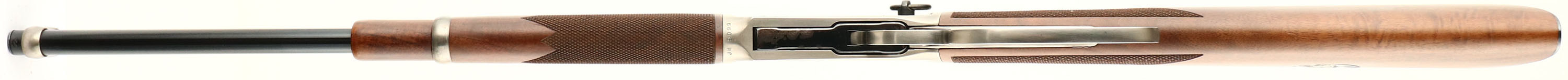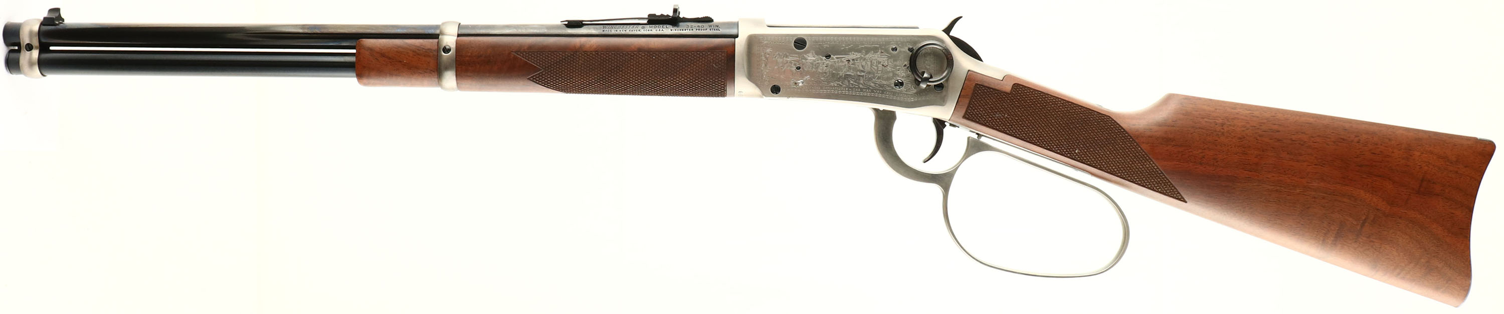 BOXED Winchester, Model 94 JOHN WAYNE SADDLE RING CARBINE Commemorative, .32-40 Cal., MFG. 1981, SN: JW 9099, Lever Action Rifle, 18'' barrel, Full Mag. The factory checkered wood stocks are mint, along with the factory finish. The original metal blue finish is 99%, except on the belly of the receiver forward of the lever where there is some flaking of the finish. The satin silver finished receiver is very good, but the left side of the receiver does have spotty areas of corrosion from improper storage. Also satin silver finished large lever loop & barrel bands, which are excellent. Bore is excellent & bright. Inlaid John Wayne medallion in right side of stock. Factory sights. Carbine style metal buttplate. Blued saddle ring has pittting. Looks unfired. Comes in factory styrofoam box, with owner's manual, booklet, hang tag & outer sleeve. Only 49,000 produced. A popular commemorative collectible. FFL or C&R Req. - Value: 1000 to 2000