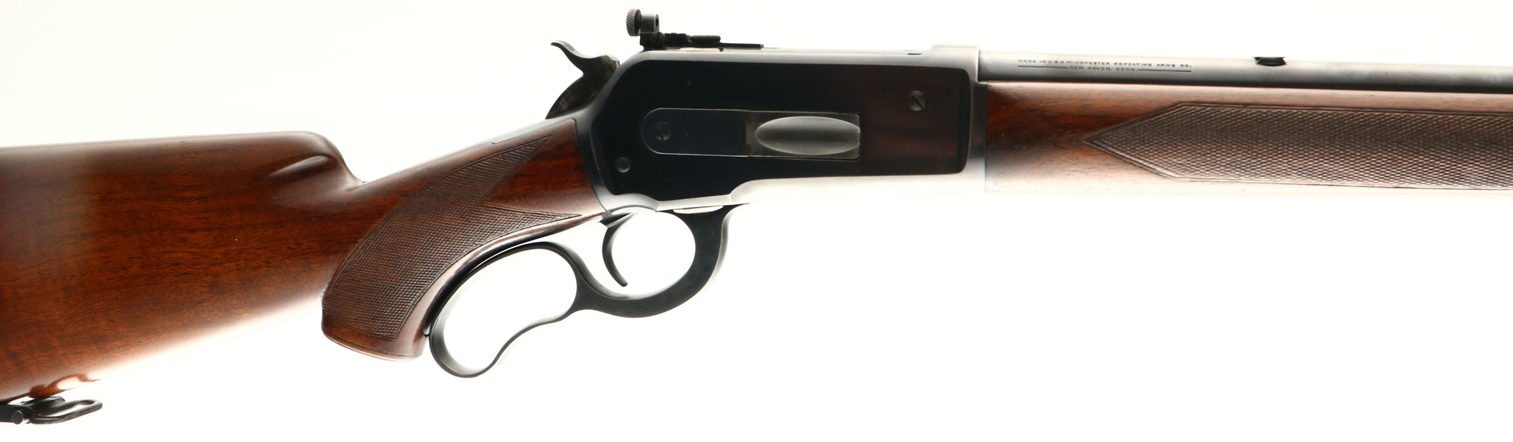 Winchester, Model 71 Deluxe Long Tang, marked 348 W.C.F., MFG. 1936, SN: 9198 (2nd Year Production), Lever Action Rifle, 24'' Round barrel, 2/3 tube mag holds 4 cartridges. An improved model 1886, with just 47,254 made & only 16,900 as Long tangs, & fewer deluxe models, which are in high demand amongst collectors & command premium values. The checkered & capped pistol grip wood stocks are excellent, solid & original. The stocks carry the original finish. There is a small glue repaired corner chip at the upper left shoulder of the wrist & very few other minor scuffs or contusions. The original metal blue finish is 95% on barrel & mag., 90% on receiver, with loss due to carry wear on the belly. Factory upgraded with the rare 100 & 200 yard adjustable breech bolt peep sight, blank filled rear dovetail & front ramp hooded sight. Factory checkered metal buttplate. Excellent bore. Factory sling mounts, with swivels. A rare Winchester in the most collectible caliber & with the desirable long tang, breech peep & deluxe checkered wood. Excellent collectible. FFL or C&R Req. - Value: 3000 to 5000
