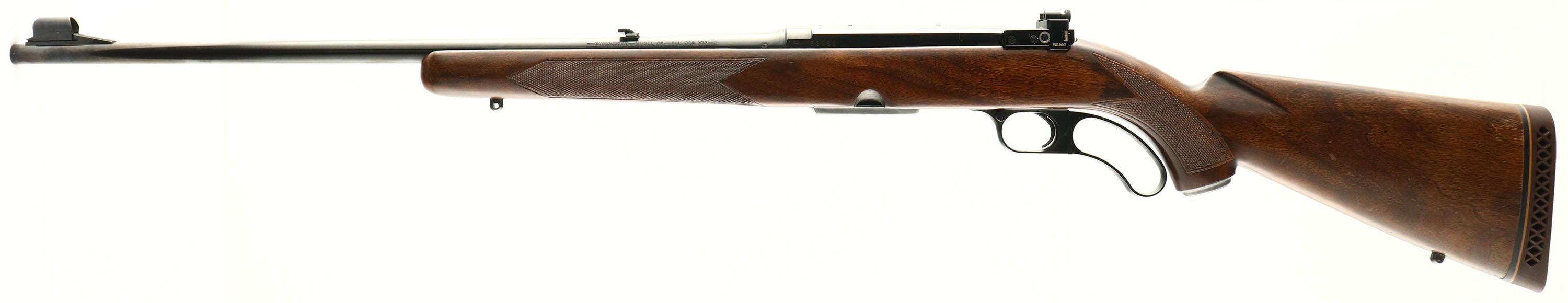 Winchester, Model 88, marked Cal. 358 WIN, MFG. 1958, SN: 69981, Lever Action Rifle, 22'' Round barrel, Pre-64, The checkered & capped pistol grip wood stock is original & excellent. This example has the early diamond cut checkering. The original finish was professionally removed, very lightly sanded & expertly refinished, without wood loss or affecting the checkering. There are some minor finish level scrapes & contusions. The original metal blue finish is 98% overall. Bore is excellent. The receiver is fitted with a Williams receiver sight in factory holes, while the barrel carries a folding rear sight & hooded ramped front sight. The stock carries a Pachmayr ventilated recoil pad. Sling studs. Excellent overall condition example, which remains collectible in this rarest & most desirable caliber. FFL or C&R Req. - Value: 1500 to 3000