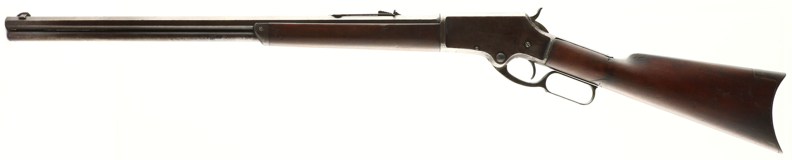 Marlin, Model 1881 Burgess, 38-55 Cal., MFG. 1887 (Antique), SN: 17397, Lever Action Rifle, 24'' Octagon barrel, Full mag. The original wood stocks are good & solid. The finish has darkened with age, use & oiles. There are a few 1'' hairline cracks emanating from the lower tang. The foreend has a couple of 2'' crack repairs on the right side. The stocks also have several small to minor contusions, scratches or scrapes. The metal surfaces have worn to a mix of gun metal gray, brown patina & remaining blue, with most remaining coverage found on the barrel. Barrel carries the original adjustable rear & an elongated half moon blade front sights. Bore is fair, but with lots of roughness & scarring amongst strong rifling. Stock carries a crescent metal buttplate. Action remains tight & smooth. With approximately 20,000 produced in all calibers, these are fairly rare in any found condition. Antique No FFL Req. - Value: 1000 to 2000