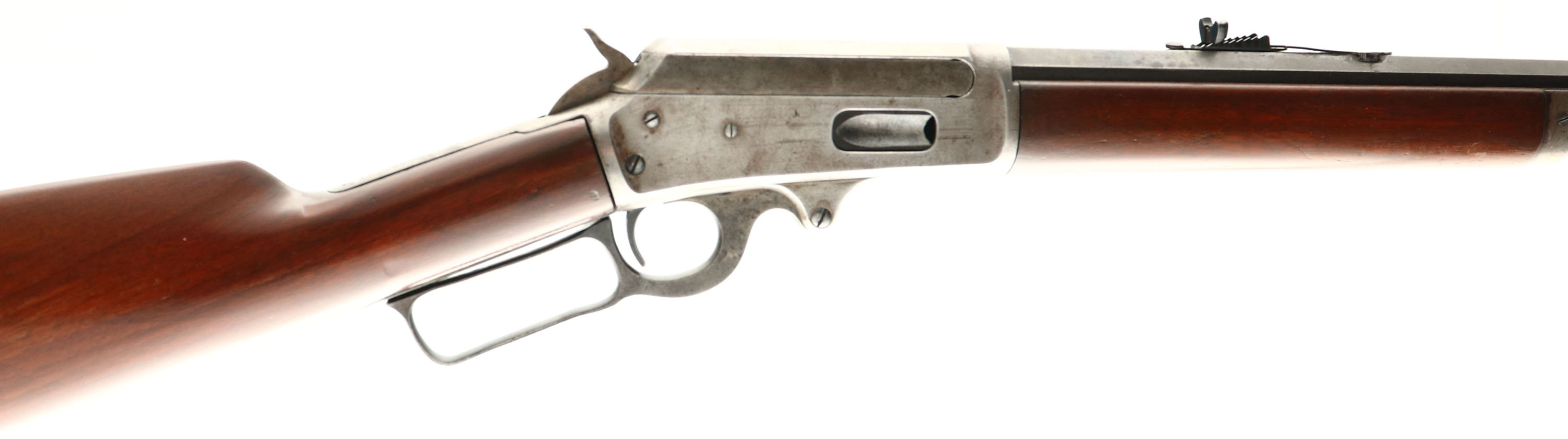 Marlin, Model 1893 Short Rifle (Carbine), marked 30-30 Cal., MFG. 1901, SN: 222399, Lever Action Rifle, 20'' Octagon barrel, Marked ''SPECIAL SMOKELESS STEEL''. Full mag. The wood stocks are good & solid, but the stock is a combination of two stocks with the back 3'' of the buttend having been added to stock to restore the original look & length, which was likely cut short at one time. The stocks were then sanded & refinished, with few minor scrapes, scratches & contusions remaining. The metal surfaces has worn mostly gun metal gray, with thin remnants of orginal blue remaining in the more protected areas of the barrel. Barrel carries an updated Marbles adjustable rear sight & tall blade front sight. Bore is good, but with roughness amongst strong rifling. The stock carries the original carbine style metal buttplate. The lever has some bend & denting to its shape. Action remains tight & smooth. This would make a fun to shoot or hunt with short rifle. FFL or C&R Req. - Value: 400 to 800