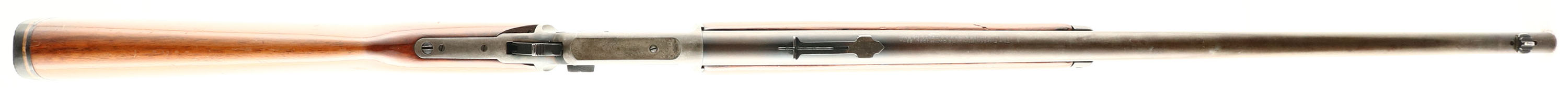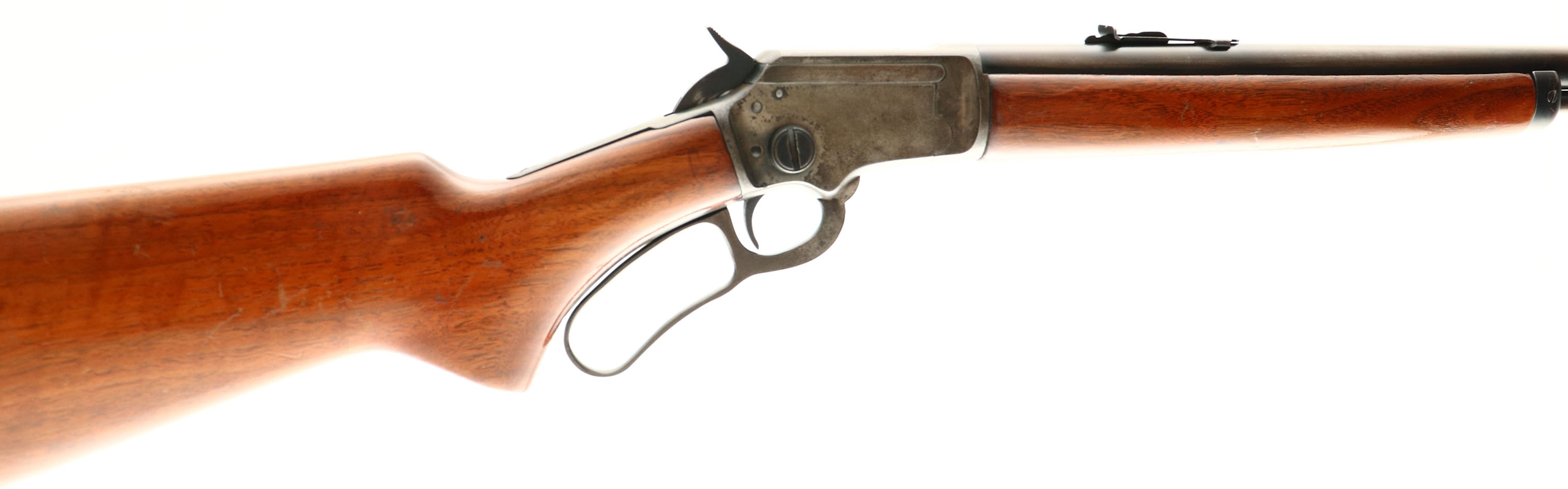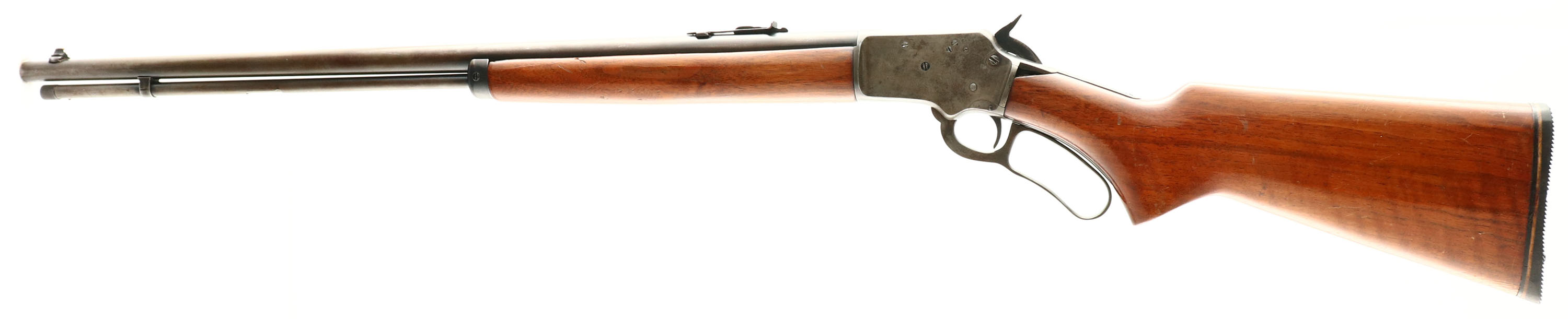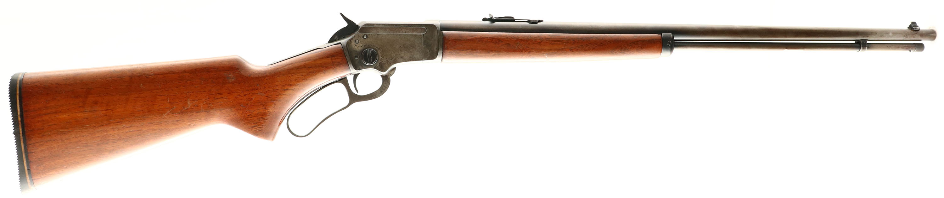 Marlin, Model 39, .22 S. L. LR Cal., MFG. 1945, SN: B6804, Lever Action Rifle, 24'' Round barrel, Full mag. The original flat pistol grip wood stocks are fair, having been sanded & refinished. There is a 1/2'' x 1'' missing corner chip at the left side of the wrist & a 2'' replaced toe break repair. There are minor contusions, scraps & scuffs remaining. The metal blue finish on the barrel & mag tube has worn to gun metal gray, with a thin brown patina, while the case-hardened receiver has also worn or faded gray with some remnants of case-colors in protected areas. Bore is excellent. The barrel carries an adjustable rear & blade front sight. Stock carries a thin serrated black rubber recoil pad. Marlin bullseye located in belly of the stock. Tight action. FFL or C&R Req. - Value: 300 to 600