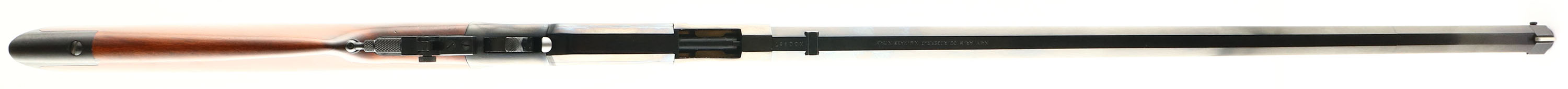 Uberti, Model 1860 Henry Rifle, STEEL Frame, CAL: 44-40, MFG: Modern, SN: H00687, Lever Action Rifle, 24 1/4'' Octagon barrel. Navy Arms Co. importer. The original straight grip wood stock is excellent, displaying minor handling marks the original finish. There is 1 1/4'' stress cracks at each side of the toe & a tiny edge chip. The high polished blue finish on the receiver, barrel & tube is 99%, excellent. Bore is excellent, near mint. The receiver is fitted with a flip-up tang sight, while the barrel holds a blank filed rear dvetail & silver blade front sight. Stock carries a crescent metal buttplate. A fine reproduction of the antique original. FFL Req. - Value: 1000 to 1700