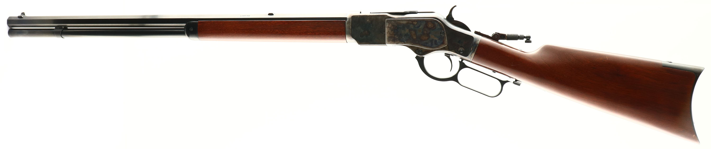 Uberti, Model 1873 Rifle, CAL: 44-40, MFG: Modern, SN: 53282, Lever Action Rifle, 24'' Octagon barrel. The original straight grip wood stocks are excellent, displaying very few minor handling marks the excellent original finish. The high polished blue finish on the barrel & tube rates excellent 99%. The receiver displays vivid case-colors. Bore is excellent, near mint. The receiver is fitted with a flip-up tang sight, while the barrel holds a blank filed rear dvetail & small blade front sight. Stock carries a crescent metal buttplate. A fantastic reproduction of an American classic. FFL Req. - Value: 1000 to 1800