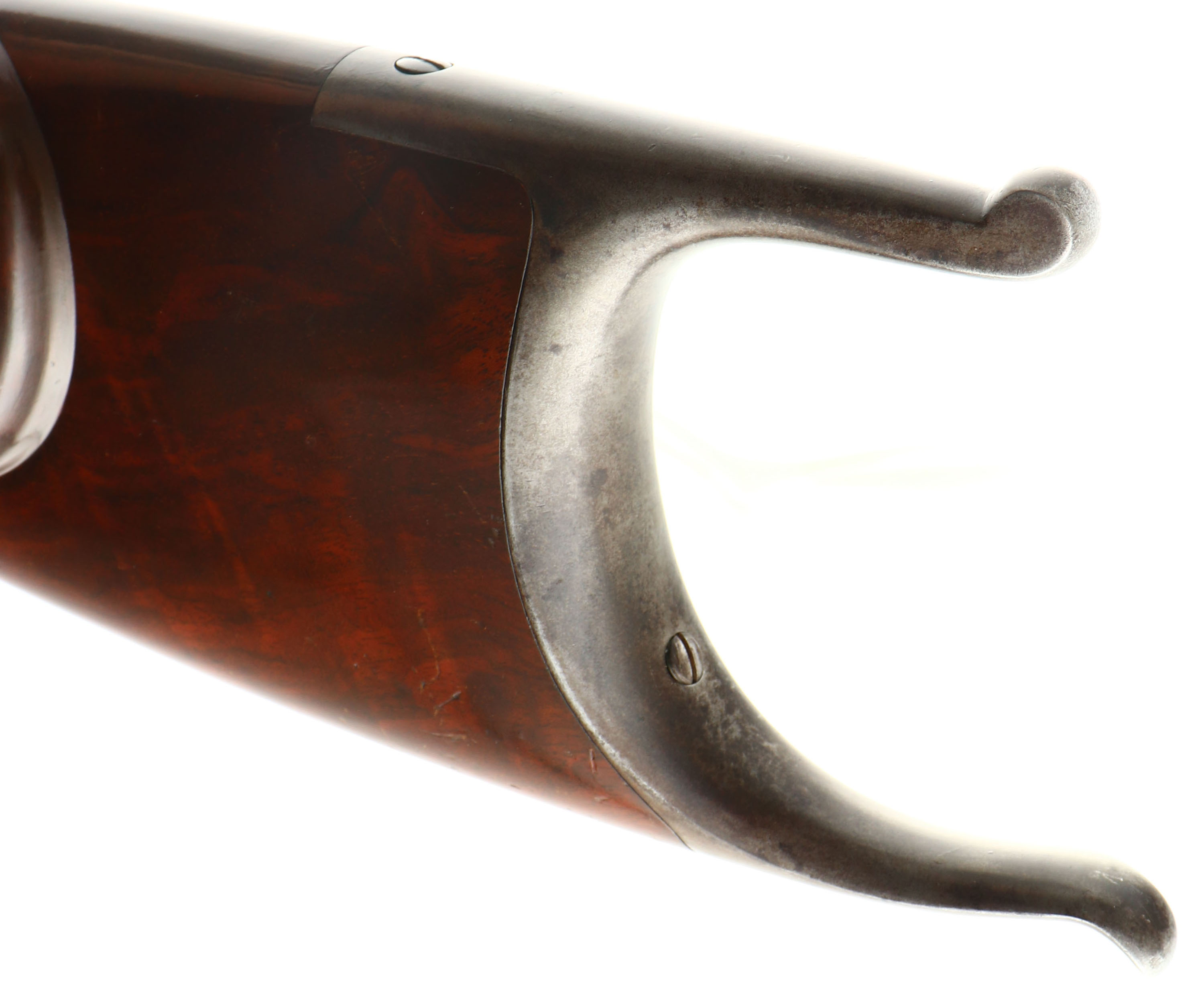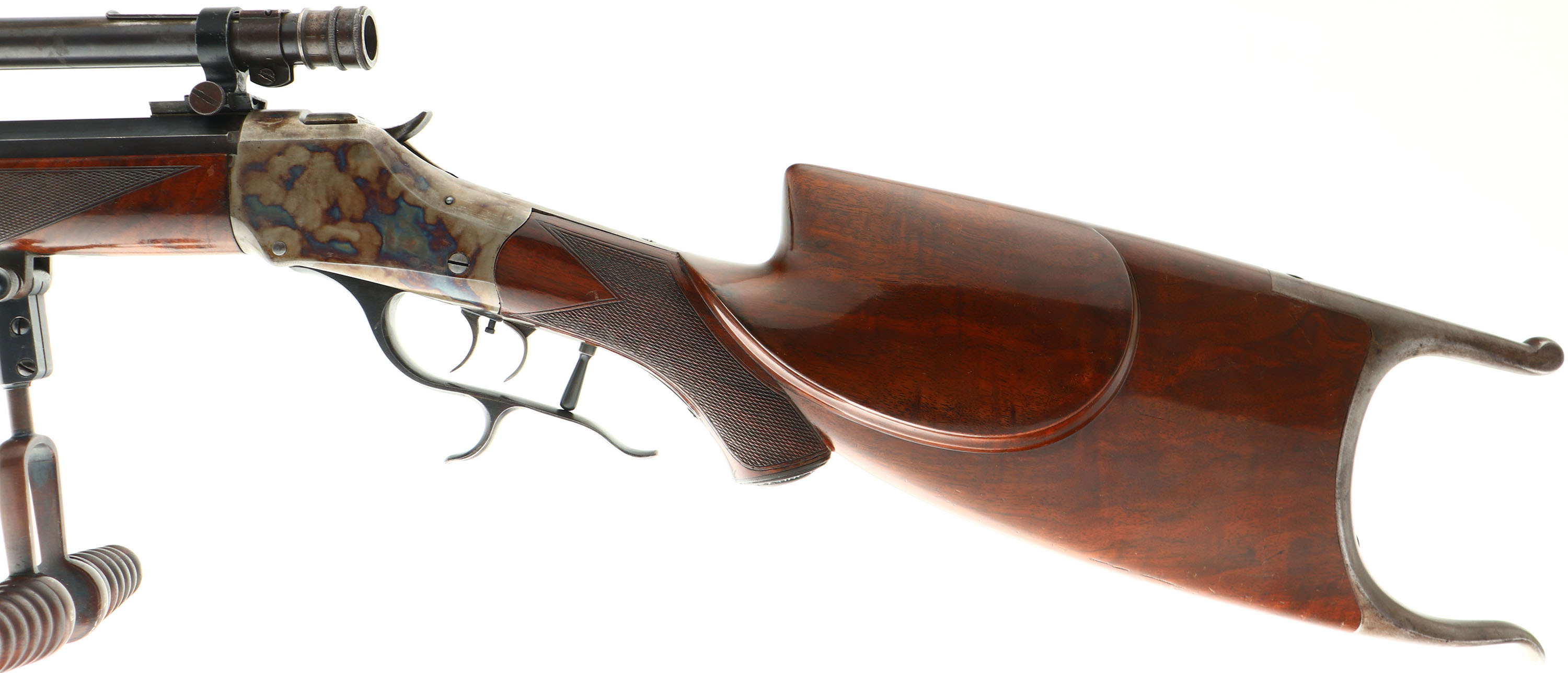 Winchester, Model 1885 Schuetzen Rifle, .32-40 Cal., MFG. 1896, SN: 75112, Lever Action Single Shot Rifle, 29 1/2'' Full Octagon #4 Heavy barrel. This Rifle presents as a custom built replica of the factory special order Deluxe Schuetzen rifle. According to the Cody Museum Winchester Factory Records SN 75112 started life as a standard rifle in 32 WCF, with a 28'' #1 weight barrel. The rifle has since been customized & carries a number of features consistent with the deluxe Schuetzen models. It carries a XX 1st style Swiss cheeked stock, with a steep rise top comb, deluxe checkering, capped pistol grip & a nickeled Swiss Schuetzen buttplate. The Schnabel style forearm has an ebony inlay in the tip, deluxe checkering & a folding palm rest. Both stocks display fantastic grain & the majority of the high gloss finish. The are a handful scuffs & light handling marks as well as a small repair to the cheek edge & a 6'' thin finish level scratch on the right side of the stock. The metal blued finish on barrel rates at 95%, while the case-hardened receiver displays fantastic case colors, The lever has had the spur very nicely added to an original 1885 lever that has also been reshaped. The rifle carries double set triggers which work correctly. The bore rates excellent. Barrel is mounted with a 16'' Winchester A5 scope on Winchester mounts, a blank filled rear dovetail & silhouette front sight. The barrel is marked ''32-40'' on top of barrel flat & under forearm. The barrel is also marked with a ''4'' for barrel weight ahead of forearm & under forearm. It is also stamped with the assembly # ''6159'' under the forend. The side of left tang of the receiver is marked with ''XX'' & ''6159''. The buttplate is also stamped ''6159'', as is the buttstock on the buttend & upper channel. This rifle has a wonderful appearance & remains highly collectible as presented as a deluxe Schuetzen 1885 rifle. Antique, No FFL Req. - Value: 3000 to 6000