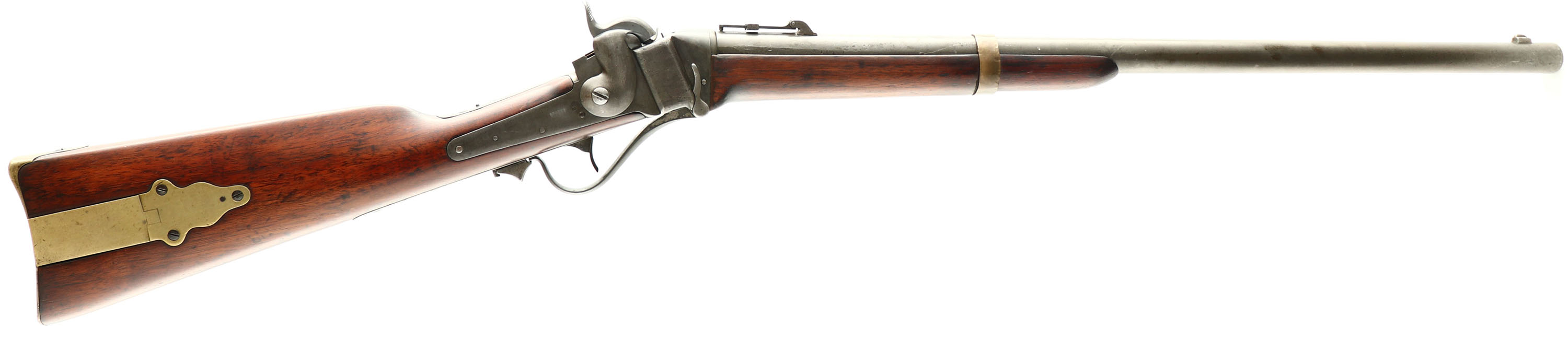 RARE Sharps, Model 1853 Slant Breech Carbine, 52 Cal , MFG 1853-55 Antique, SN 21330, Lever Action, 25'' Round barrel. The Sharps Model 1853, sometime referred to as the Slant Breech or Sloping Breech, was an improvement on earlier carbines. Roughly 10,500 Model 1853 carbines were produced between 1853 & 1858. The top of the barrel is stamped ''SHARPS RIFLE MANUFG CO. HARTFORD. CONN.'' forward of the rear sight. Matching serial number on the barrel under the forearm & top tang. The left side of the receiver is marked with the two line ''SHARPS PATENT'' stamp. The top of the receiver ahead of the SN is a worn ''SHARPS PATENT 1848'' The original wood is good & solid, but has been sanded & refinished, with several areas of fill & evidence of the numerous chips, nicks & dings remaining. The stock carries a hinged patch box & brass carbine buttplate. The rifle's metal surfaces have fully worn a gun metal gray. The barrel is fitted with the forward folding ladder rear sight & standard front sight. Bore is very good, with some roughness amongst strong rifleing. This is a rare example of a Sharps SLANT Breech in complete surviving condition. Antique No FFL Req - Value: 2000 to 4000