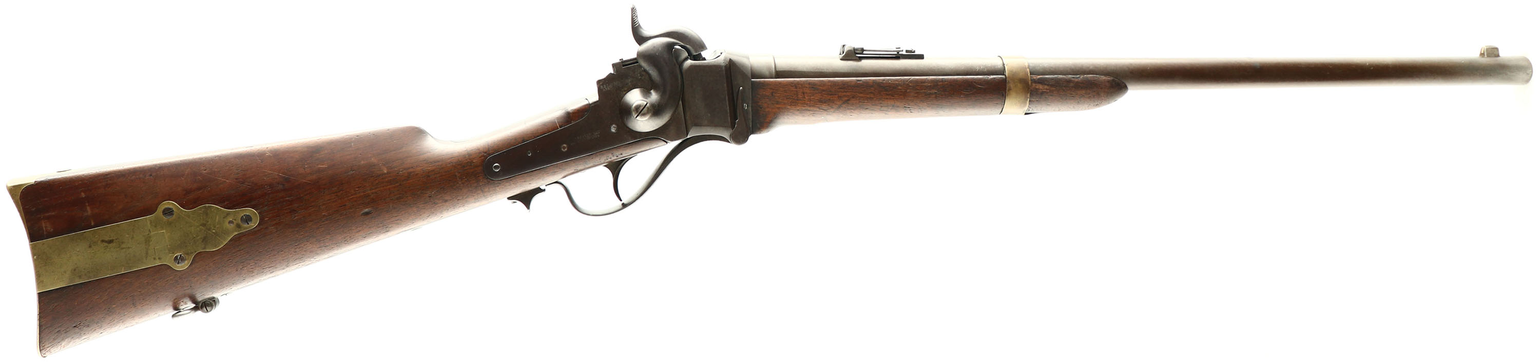 Sharps, Model New Model 1859 Carbine, .52 Cal., MFG. Antique, SN: 32071, Lever Action falling block, 22'' Round barrel, A Civil War Sharps Saddle Ring Carbine. Approximately 27,000 New Model 1859 were produced, with this rifle being an early production example as it still utilizes the brass buttplate & forend band, which was later changed to iron furniture. The original wood stocks are very good & solid, with numerous minor to small contusions, scratches & dings to the surviving original finish. Tiny chip at the toe. The stock carries a hinged patch box & brass carbine buttplate. Cartouche inspector stamp on left wrist under the saddle ring bar. The metal finish on the barrel has worn mostly gun metal gray with a thin brown patina, while the receiver has a darker chocolate brown patina. Bore rates very good, bright with strong rifling. The barrel carries the slide adjusting R.S. Lawrence rear ladder sight, with strong snap, & a carbine blade front sight. Markings on right side plate: Sharps Pat Oct 5th 1852 & RS Lawrence PAT April 12 1859, on other side, Pat. 1848. The top of the barrel is stamped ''SHARPS RIFLE MANUFG CO. HARTFORD. CONN.'' forward of the rear sight. Matching SN on upper tang & on belly of barrel under the forend. Saddle ring bar & ring on left side. The stock carries a sling loop. A solid & original condition surviver of a Civil War era carbine. Antique No FFL Req. - Value: 1500 to 3000