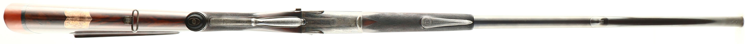 On this rifle, the cheeked, checkered & capped pistol grip walnut stocks are excellent, with a few minor handling marks to the original finish. Fantastic contrasting grain & fine hand checkering on both pieces of furniture. The belly of the stock has an inlayed gold shield, which is wonderfully engraved with a coat of arms. The case-hardened receiver displays muted case colors, with the receiver, side plate, lever, trigger guard, upper tang, forend lever, portion of the barrel & even the leaves of the rear sight all displaying high density coverage of fine vine & scroll hand engraving. The original blued barrel rates 90% coverage of a plum toning chocolate brown finish. The top of the barrel is engraved ''ALEX.R HENRY EDINBURGH & LONDON'', with British proofs on the belly of the barrel under the forend. The barrel carries a five leaf express rear sight, with leaf's marked with ranges 100, 200, 300, 400 & 500 yards. The muzzle of the barrel carries a platform raised front blade sight, with a flip-up ivory bead option. It is slotted along the side for possible use of a hood. Top of the receiver is engraved ''HENRY'S No. 243 PATENT''. The right side-plate has the auto-cock indicator, with gold ''COCKED'' lettering. The bottom of the barrel is stamped ''400 EX''. Bore is excellent & bright. The buttstock carries a solid red recoil pad. Sling provisions. Comes with an empty cartridge in the case with the headstamp indicating 450-400, which fits properly in the breech. The rifle comes displayed in a magnificent Maker's alligator hide wrapped oak case, with gold embossed lettering ''HIS HIGHNESS THE MARHARAJ RAN OF DHOLPUR''. The case also indicates that it is for ''RIFLE 6659'', one off from this rifle's SN & likely for the sister rifle to this rifle. Inside the case is a leather gold embossed Maker's label ''ALEXANDER HENRY EDINBURGH & LONDON'' & two by Special Appointment crests. The case come with a large number of tools & accessories including, Combination capper/de-capper - seats and/or removes primers, Bullet crimper, Bullet seating tool, Bullet mold with sprue-cutter, Oil bottle with applicator tip inside screw-cap, Wad-cutter, Combination case extractor & several others.