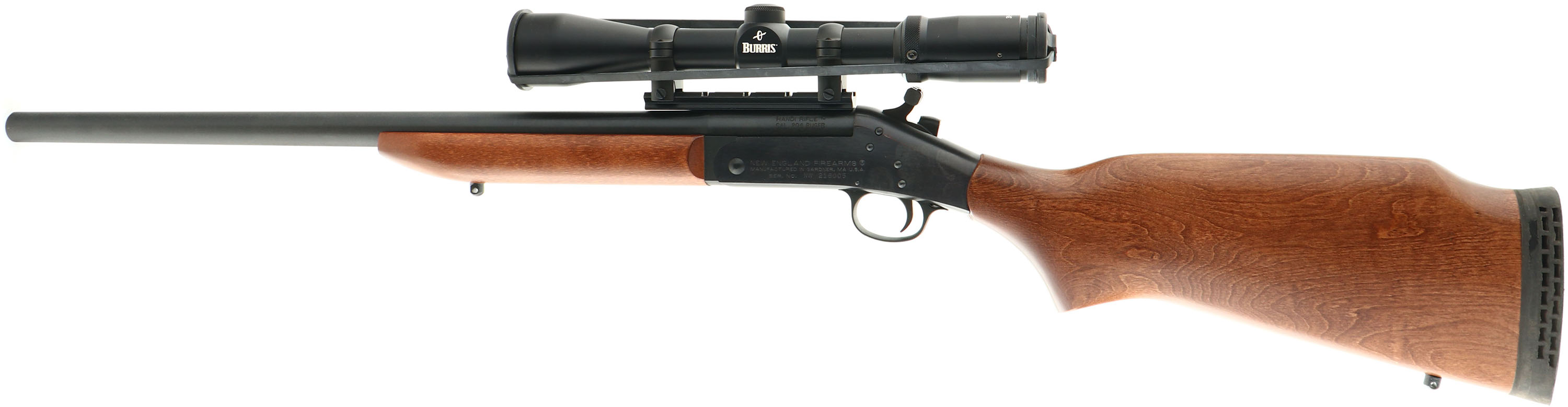 New England Firearms, Model Handi Rifle, CAL: 204 Ruger, MFG: Modern, SN: NW216005, Break Action Single Shot Rifle, 22'' round barrel. The original flat pistol grip wood stocks are excellent, displaying very few tiny blemishes to the excellent original finish. The metal blue finish rates 95% overall, with the receiver starting to tone plum. Bore is very good. The rifle carries a Burris 3X-9x 40mm Fullfield scope mounted on a picatinny & no open sights. The buttstock carries the factory ventilated black rubber recoil pad. Sling studs. FFL Req. - Value: 200 to 400