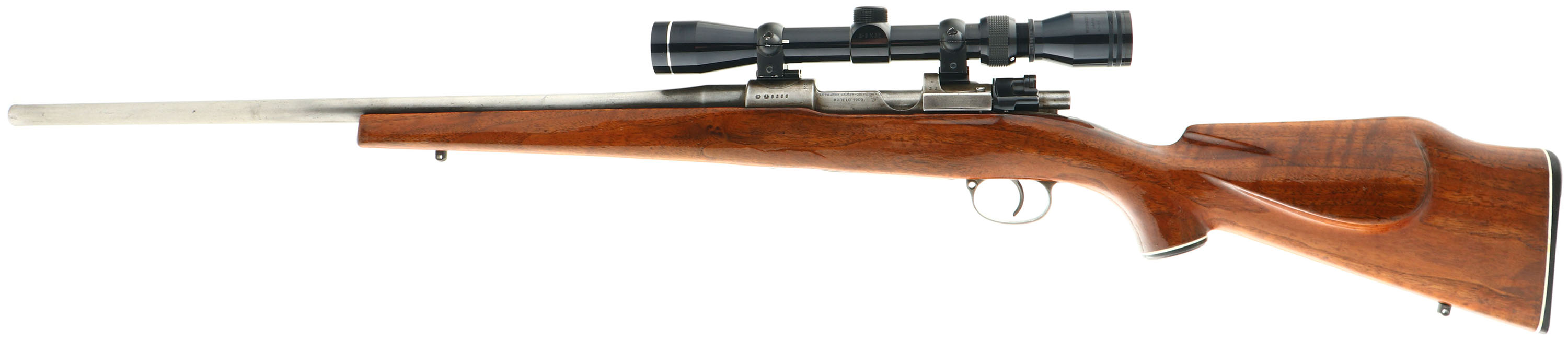 CUSTOM Waffen Fabrik Mauser Oberndorf A/N, Model M1909 Peruvian Mauser, CAL: 7X57mm, MFG: 1910-14, SN: 9566, Bolt Action Rifle, 22'' custom barrel. Barrel stamped ''7MM'', which in this case is 7X57mm, a current production & affordable hunting round similar to a 270 Winchester / 270 Rem round in ballistic performance. The custom cheeked & capped pistol grip Monte Carlo wood stock is excellent. The wood shows several minor to small scrapes, scratches & contusions to the thick high gloss finish. The metal finishes are almost fully worn away to a gun metal gray. Barrel channel bedded to barrel. Bore is excellent. & bright. The receiver holds a Tasco 3-9x32 scope, while the barrel has no provisions for open sights. Buttstock carries a serrated plastic buttplate. Sling studs. FFL or C&R Req. - Value: 250 to 500