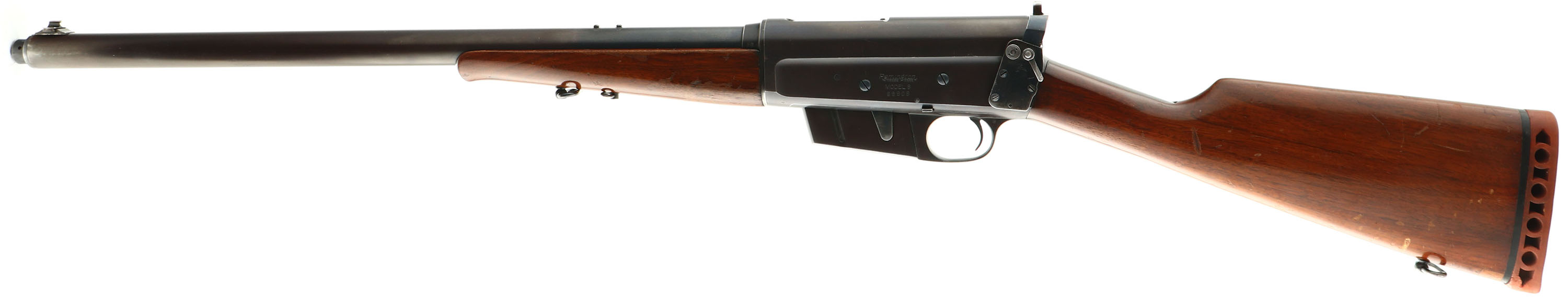 Remington, Model 8, .35 Rem Cal, MFG. 1936, SN: 69908, Semi-Auto Rifle, 22'' barrel. As a 1936 rifle, it is a last year of production example & one of the last & highest encountered SN's. The straight grip & schnabel forend stocks are very good & soild. There are numerous minor to small handling, nicks, scrapes & contusions to the original finish, which has some flaking & thinning at the carry points. The stock carries a Red Head ventilated recoil pad, which required the stock to be straight cut & a small filler piece of wood to fill the void from the lower tang of the old buttplate. The original metal blue finish rates 60% overall, but like most mid to late 1930's rifles, the blue is toning plum as it thins. Bore is excellent. The rifle carries a Lyman 41 side mounted receiver sight, while the barrel carries two filler screws in the rear provisions & a standard blade front sight. 4 round fixed magazine. Tight action. The stock & forearm carry sling loops. A well set up hunting rifle in the popular hunting 35 caliber. FFL or C&R Req. - Value: 400 to 750