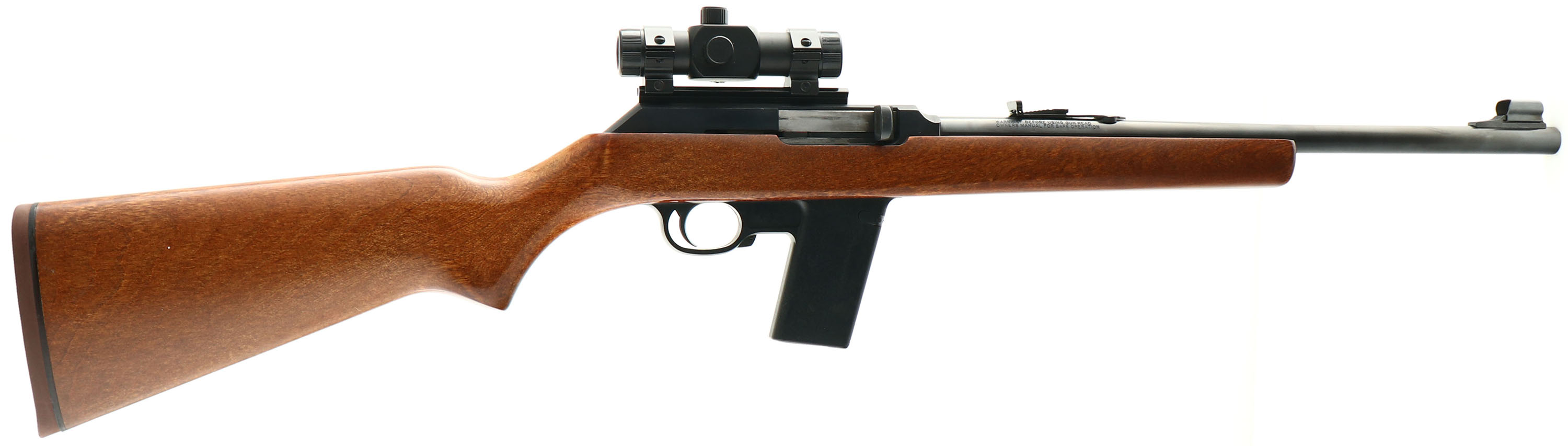 Marlin, Model 45 ''Camp Carbine'', CAL: 45 ACP, MFG: Modern, SN: 45001627, Semi Auto Rifle, 16 1/2'' barrel. The original flat pistol grip stock is excellent, with few tiny handling marks to the original finish, which is thinning a bit at the top of the wrist. The metal blue finish on the barrel rates 99% overall. Bore is excellent. The receiver carries a BEC INC. Miradot 1X20mm scope, while the barrel carries an adjustable rear & hooded blade front sights52. Stock carries a Marlin solid recoil pad. Comes with a Marlin marked detachable mag, but will fit any standard sized 7 or 7+ round M1911 single stack mag. FFL Req. - Value: 600 to 1000
