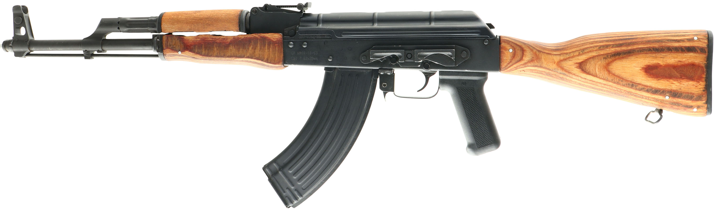CN Romarm SA (Cugir Arms Factory in Romania) CAI import, Model: GP-WASR-10/63, Cal: 7.62x39mm. MFG: 1986 (parts kit date), S/N: SBO-0362-86, Semi-auto Rifle, 16 '' barrel. These rifles were made in Romania in a sporter configuration (Single stack mag wells, bores not fully rifled/bored, & alternate stock sets, Etc). CAI Re-configured them when they were imported to the classic AK Look. Some of the modifications appear rough but the rifle is fully functionable. The Laminated wood stock set is excellent with only light handling wear, the wood is unfinished. The black phosphate finish rates 90% with light scuffs, scratches & wear. The left side of the receiver is marked with the model & caliber, the right side is marked with MFG & import info. Left side of the receiver has a Russian optic mount. It has a Tapco Hammer & trigger, single stage trigger with Approx. 4lbs Pull. The bore is very good. Its bright with spots of light roughness in the grooves. Chrome lined bore. The muzzle device is spot welded into place. The barrel holds a post front sight with protective wings. Rear sight is a Tangent U-notch marked 1 to 10 with a rear battle Zero marked ''P''. The buttstock carries a steel trapdoor buttplate, nothing inside the stock. Rifle has a cleaning rod, & comes with one 30rd Mag. FFL Req. - Value: 600 to 1200