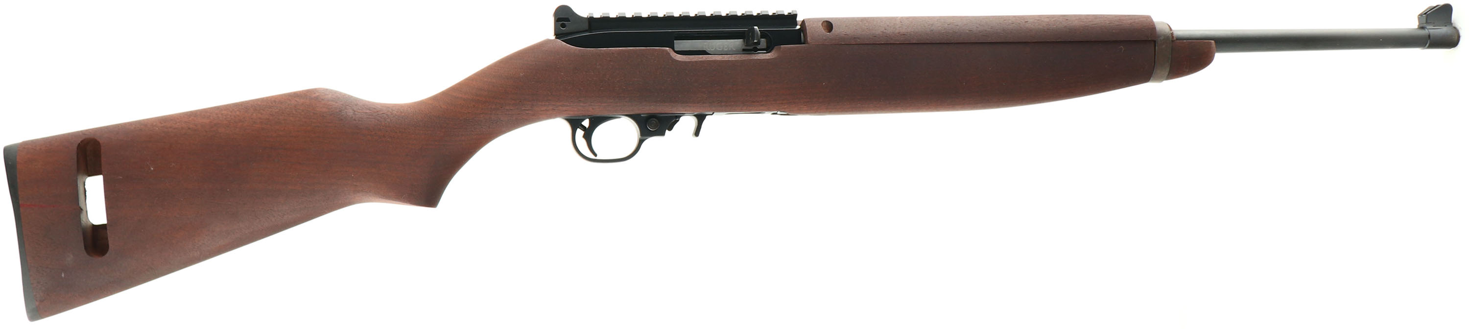 Ruger, Model 10/22 M1 Carbine Tribute, CAL: 22 LR, MFG: Modern, SN: 0020-22549, Semi Auto Rifle, 18 1/2'' barrel. Among the most useful, reliable, and practically accurate .22 caliber rifles made is the Ruger 10/22. Introduced in 1964, the Ruger 10/22 has become the most popular .22 rimfire rifle in America. The M1 .30 Carbine was used in World II, Korea, & Vietnam & is a highly collectible firearm. Light, handy, & firing a mid range cartridge, the M1 carbine was the first low-maintenance military rifle & the first issued with non-corrosive ammunition. Ruger has introduced a version of the rifle that is similar in appearance to the M1 Carbine. The Ruger 10/22 M1 version isnt a reproduction as it is chambered in .22 Long Rifle, but it is fittingly called a tribute to the M1. The flat pistol grip M1 style wood stocks are excellent, with virtually no handling marks to the excellent original flat oil finish. The stock includs a slot in the rear of the stock that allows the use of a sling in the original M1 carbine manner, along with the sling loop on the forearm barrel band. The metal blue finish rates 100%. Bore is excellent & bright. The receiver carries a M1 style aperture type rear sight & a picatinney rail, while the barrel holds a the M1 blade sight with protective flared wings. Buttstock carries a smooth plastic buttplate. Comes in Ruger's replica U.S. marked tan canvas carry bag & ammo pouch. Excellent overall condition. FFL Req. - Value: 400 to 600