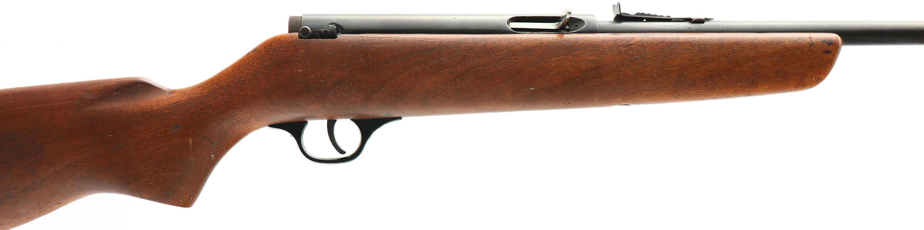 Marlin, Model 88, CAL: 22 LR. Only, MFG: early 1950's, SN: NONE, Semi Auto Rifle, 24'' barrel. The original flat pistol grip wood stock is very good, with several minor scrapes, scratches & contusions to the original stain & oil finish. The metal blue finishes rate 85% overall, with some staining & speckling on the barrel. Bore is excellent. The barrel carries an adjustable rear & hooded blade front sights. The stock carries a metal buttplate, with the tubular mag fed in the stock. Trademark bullseye in the stock. FFL or C&R Req. - Value: 100 to 200