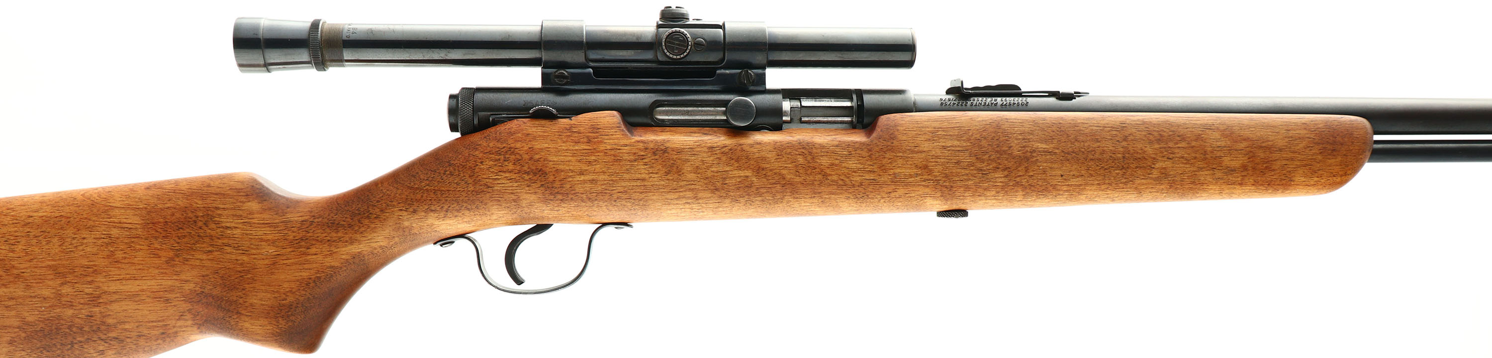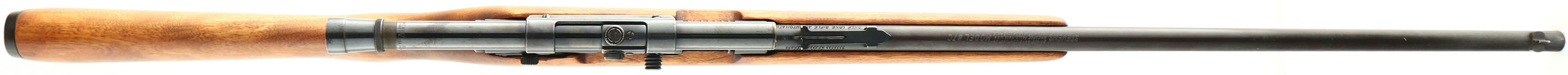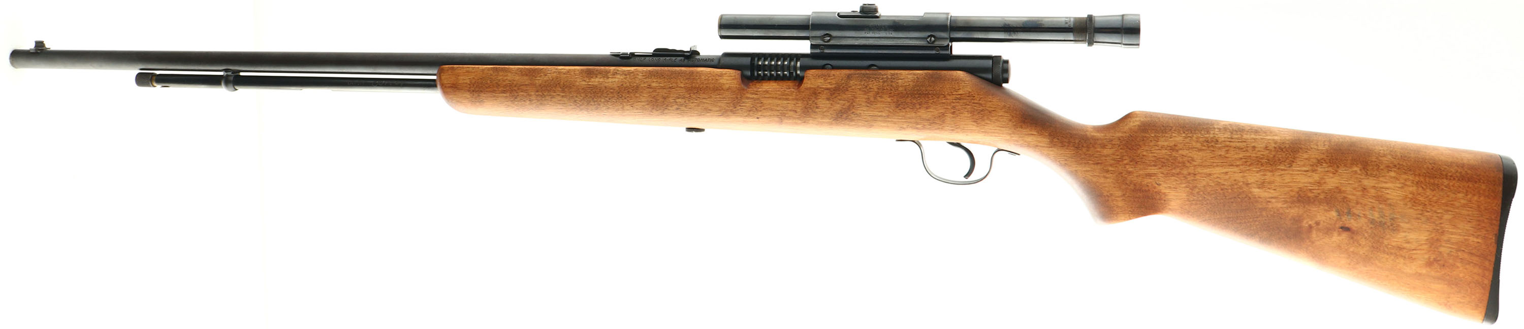 Stevens (Savage), Model 87C, CAL: 22 S.L.LR, MFG: 1949-67, SN: NSN, Semi Auto Rifle, 24'' barrel. The original flat pistol grip wood stock is excellent, with very few use marks. The metal blue finish on the barrel rates 85%, 90% on the receiver & mag tube, with the tube having the name ''John Coffey'' etched into the left side between the stock & cartridge opening. Bore is excellent. The receiver carries a Weaver scope, held by a Weaver .22 Tip Off scope mount. The barrel holds an adjustable rear sight & blade front sight. Stock carries a grooved plastic buttplate. FFL or C&R Req. - Value: 150 to 300