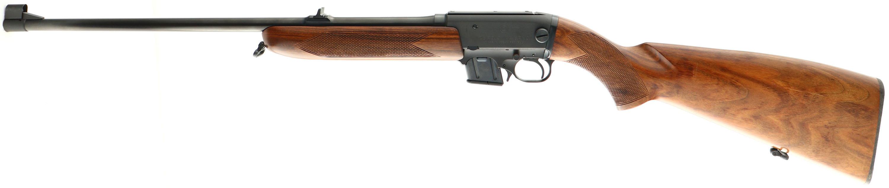 Brno Arms, Model ZKM-611, .22 WMR Cal., MFG. 1995, SN: 451503311, Semi-Autoloading Rifle, 20 1/2'' Round barrel. Detachable mag. The original checkered & flat pistol grip wood stocks are excellent & solid, with excellent original factory finish & few minor scuffs & scratches. The original metal blue finish is 98%. The top of receiver is rail grooved for scope mounts, but there is also three screw filled holes from previous scope mounting. Barrel fitted with fixed open sights. Bore is excellent. Stock carries a factory checkered black plastic buttplate. Factory sling swivels. An overall excellent semi-auto rifle. FFL Req. - Value: 300 to 600