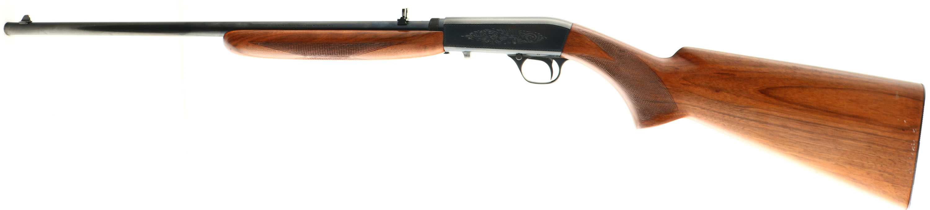 Browning Model SA-22, Grade 1, CAL: .22 LR, MFG: 1972 (Belgium), SN: 07178T72, Semi Auto Rifle, 19'' round barrel. The original checkered & flat pistol grip walnut stocks are excellent, with several minor scuffs,scratches or dings to the original finish. The original metal blue finish rates 95% overall, with some speckles or spotting on the receiver. Bore is excellent.The barrel carries a flip rear sight & blade front sight. The two factory holes atop the barrel are open. The receiver & trigger guard carry hand engraved floral/swirl pattern, with a border. Metal buttplate. FFL or C&R Req - Value: 500 to 800