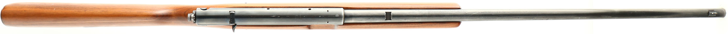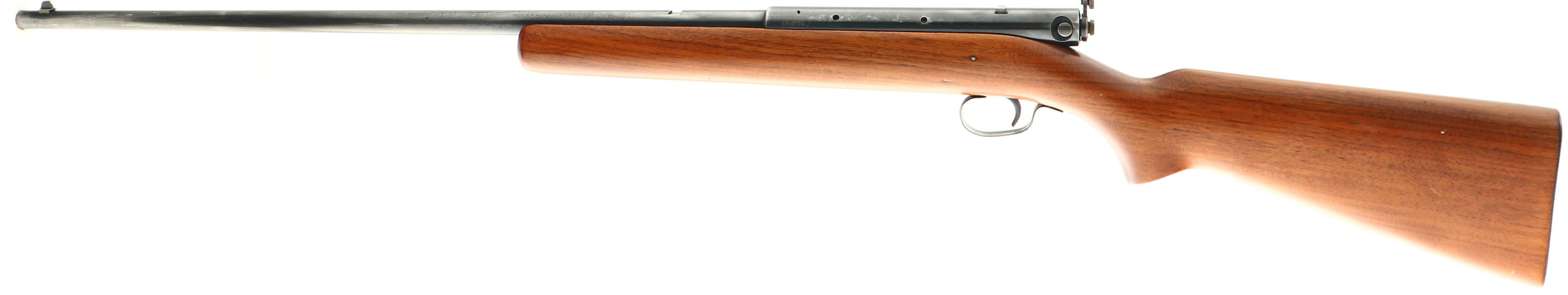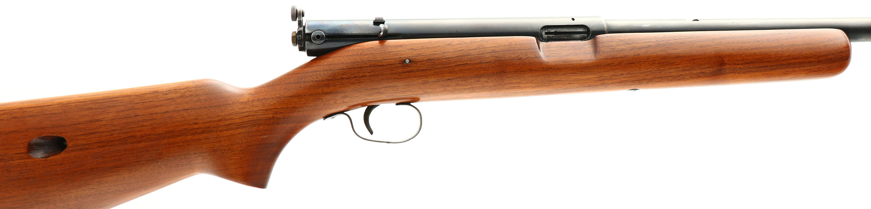 Winchester, Model 74, Marked .22 L. RIFLE, MFG. 1942, SN: 124761, Semi-Auto Rifle, 24'' Tapered round barrel, Although some 400,000 plus model 74 rifles were produced, it is a rifle that is seldom encountered & little is know. Cartridges load through the buttstock once the mag follower is removed through the metal buttplate. The original flat pistol grip, American straight grain walnut stock is excellent, having been nicely refinished. There are very few finish level minor contusions or scuffs. Factory metal blue finish rates 70% overall. Bore is excellent & bright, however there may be a small imperfection bid barrel. Fitted an unusual rear receiver sight, while the barrel has an open rear dovetail & a white bead front blade sight. The left side of the receiver has two open holes from previous scope mounting. The unique receiver mounted safety functions by sliding it side to side within a dovetail channel. A sharp looking Winchester semi-auto .22. FFL or C&R Req - Value: 250 to 400