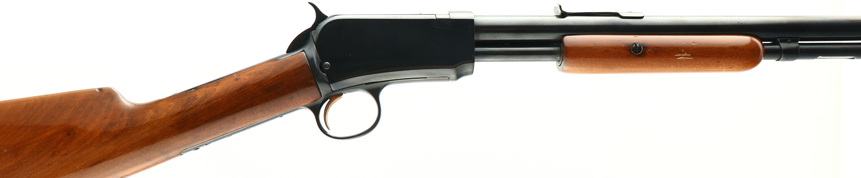 Winchester, Model 1906, .22 S. L. LR., MFG. 1910, SN: 225108, Take-down Pump Action Rifle, 20'' round barrel. This rifle has been fully refinished. The original wood stocks are very good, having been sanded & refinished. There is a 4'' tightly repaired hairline crack emanating from the upper tang & running back along the comb There are other minor blemishes & contusions to the high gloss finish. The reblued metal finish rates 95% overall, with some light speckling. Bore is fair, with cleaned roughness amongst worn rifling. Standard rear & front sights, with rear missing the elevation screw. Stock carries a Winchester plastic buttplate. FFL or C&R Req. - Value: 300 to 500