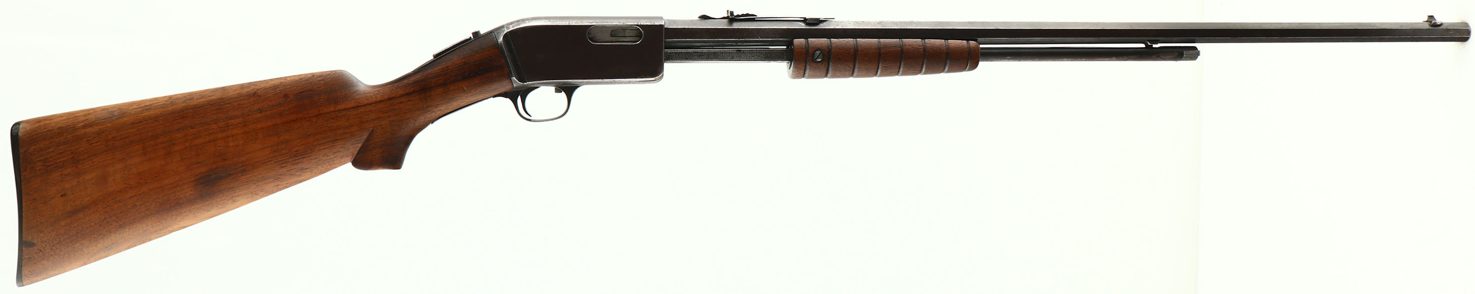 Marlin, Model 38, .22 S. L. & LR. Cal., MFG. 1921-30, SN: A8171, Pump Rifle, 24'' Tapered octagon barrel, 2/3rd mag. The original factory wood stocks are very good & solid, having been sanded & refinished some time ago. The wood has since accumulated several minor scratches & contusions, with a couple of groupings of larger dings on the left side belly of the stock. Stocks retain a nice authentic appearance. The factory metal blue finish has worn or toned to a gray/brown patina. Barrel carries an adjustable rear & small blade front sights. Bore is very good, Original Marlin buttplate. Smooth tight action. FFL or C&R Req. - Value: 250 to 500