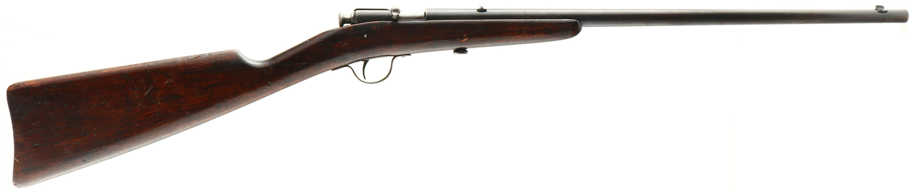 Winchester, Model 1900, CAL: .22 SHORT& LONG, MFG: 1900, SN: NONE, Bolt Action Rifle, 18'' Round tapered barrel. This is the early variation without the model # stamped on barrel. The original wood stock is good, with numerous small contusions, gouges & scrapes. The original finish has darkened with age & use, & it carries an additional layer of finish. There are a couple of hariline cracks coming off the buttend. The original metal blue finish has worn thin, with about 40% remaininig. The bore is good, with spots of cleaned pitting & corrosion amongst thinning rifling. Barrel carries a small fixed rear & small blade front sights. Buttstock carries no buttplate, which is correct for this model. Collectible early production variation. FFL or C&R Req. - Value: 200 to 400