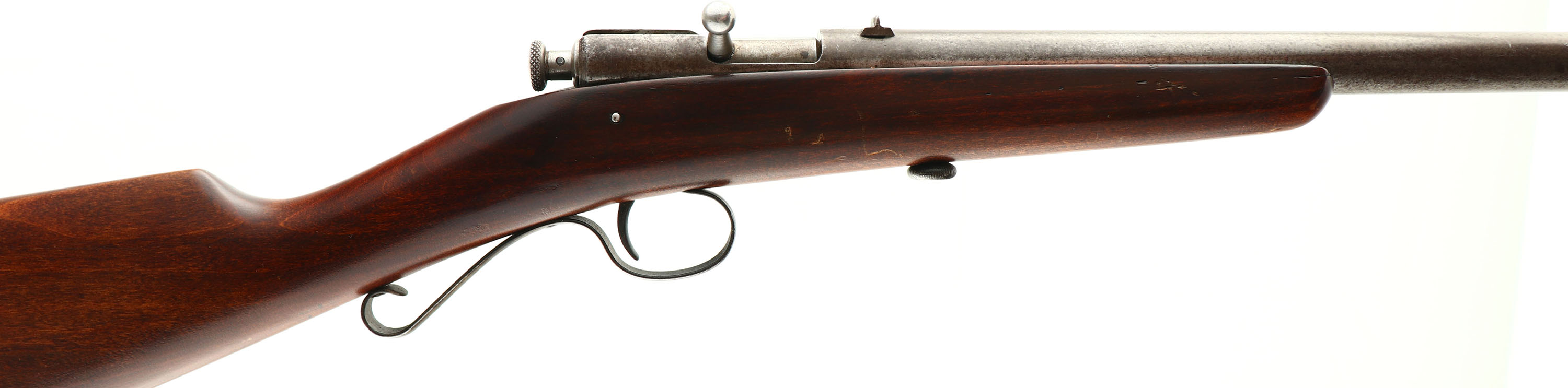 Winchester, Model 02 early variation, CAL: 22 S. L, & ExL., MFG: 1919-27, SN: NSN, Bolt Action Rifle, 18'' barrel. The 02 is a later variation of the 1902. Although the 02 was produced from 1919-31, the early variation marked .22 Short, Long & Ex Long was made until 1927 when the Ex Long was change to the more popular Long Rifle, thus this example is the earlier variation of the 02. The original straight grip wood stock is excellent, having been very lightly sanded & excellently refinished. There remains a number of minor handling marks or contusions stock. The original metal blue finish has worn mostly gun metal gray, with a thin brown patina. Bore is fair, with cleaned pitting & roughness amongst worn rifling.. The barrel holds a fixed rear & blade front sights. Stock carries a Winchester plastic buttplate. Serpentine trigger guard. A early variation 02 that presents very well. FFL or C&R Req. - Value: 250 to 500