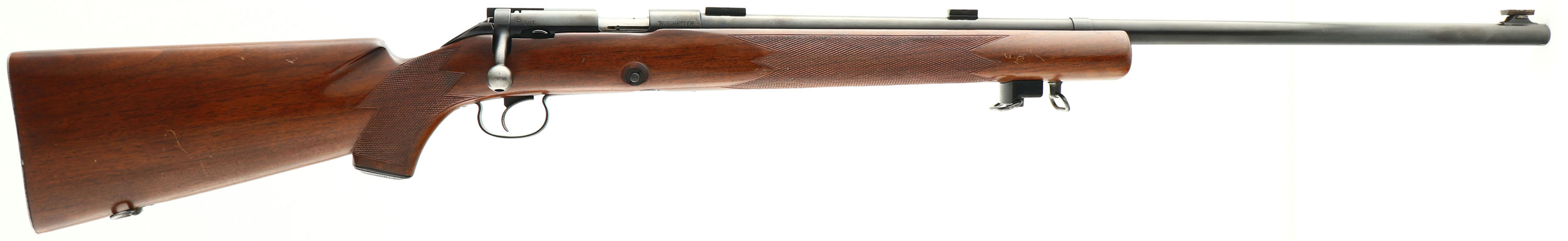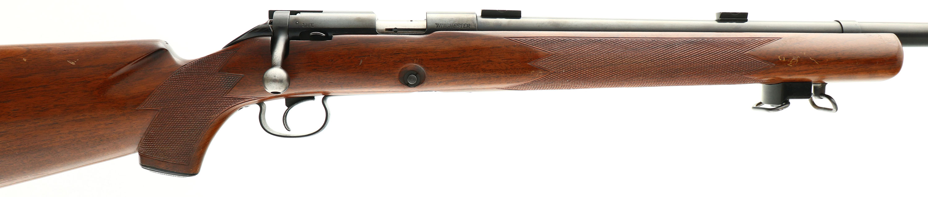 RARE & FANTASTIC Winchester, Model DELUXE 52 ''C'' STANDARD BARREL Target rifle, Marked .22 L. Rifle. Cal., MFG. 1953, SN: 79219C, Bolt Action Rifle, 28'' Standard barrel. The rifle in this auction is a matched companion to the rifle in Lot 4241. These are the only two factory model 52-C DELUXE target rifles known to exist amongst collectors. If you reference Herbert House's book on Winchester Model 52's, there are two factory checkered model 52-B rifles pictured. There owners of those two Deluxe 52-B target rifles have examined these two Deluxe 52-C target rifles & confirmed without hesitation these are truly factory original. Additionally, if you reference Roger Rule's book on the Winchester Model 70, he pictures a Model 70 Target with the same factory Deluxe checkering patterns & factory grip cap. None of the men have previously encountered another 52-C Deluxe Target rifle other than the two offered in these two lots. Both rifles were produced in 1953 & are only 367 SN's apart. This was still early in the production of 52-C rifles & has lead to speculations that the two rifles were produced by the factory for display & marketing at various national target shooting competitions. If not the case, they were at the very least likely custom ordered at the same time & for the same customer. The two rifles remain in almost identical original & excellent overall condition. Regarding the rifle in this lot, the original deluxe, hand checkered & capped pistol grip ''Marksman'' target stock is excellent. There are a few minor to small scratches, rubs & areas of finish wear to the otherwise excellent original finish. The checkering remains sharp & the overall appearance of the stock is excellent. The original metal blue finish rates 98% overall, while the receiver is starting to tone to a slight plum patina. Bore is excellent & bright. The receiver & barrel carry the three mounting blocks for scope or receiver sight attachment. Although this is simply a ''Standard'' barrel, the standard barrel is typically more desired by collectors, as most 52C target rifles carried a ''Heavy'' barrel, making ''Standard'' barrel examples rarer. The rifle has the adjustable ''Micro Motion'' trigger. The stock is fitted with the original checkered metal buttplate. Also mounted with the original forward hand stop & sling loops. The rifle carries the original Winchester stamped 5 round mag. An excellent opportunity to purchase this rare deluxe target rifle, along with its companion deluxe target rifle in the next lot.* FFL or C&R Req. - Value: 5000 to 6500