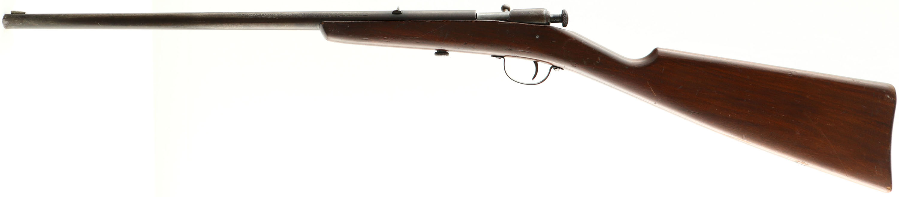 Winchester, Model 58, CAL: 22 S,L,LR, MFG: 1928-31, SN: NONE, Bolt Action Rifle, 18'' barrel. This is a fairly rare rifle as only 38,992 were produced during the four years of production. The straight grip wood stock is good, with a number of minor contusions or scrapes & a 5'' glued crack on the right side. The metal blue finish has worn to a thin brown patina. Bore is very good & bright. Factory fixed sights. Produced without a buttplate. FFL or C&R Req. - Value: 200 to 400